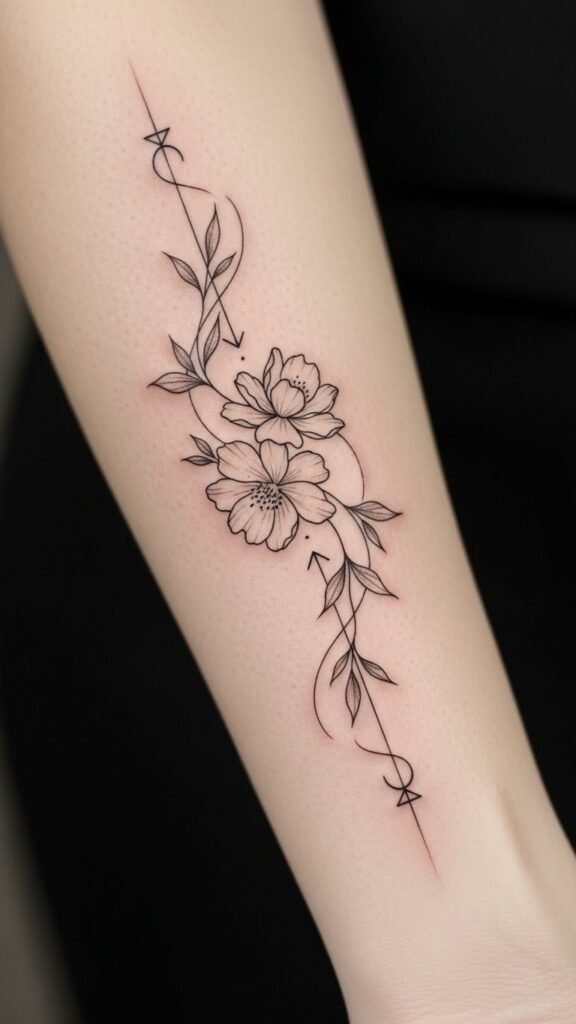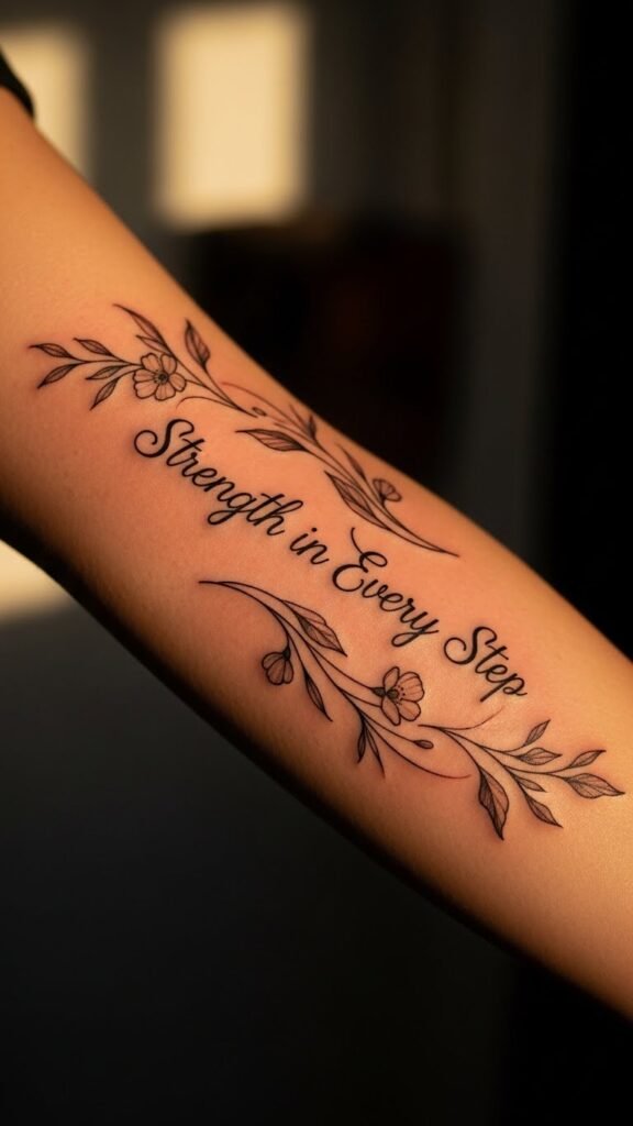 Placed on the outer forearm, the ink is easily visible, encouraging daily reflection and empowerment. The intertwining floral elements signify blossoming through adversity, while the elegant script embodies a graceful yet powerful affirmation.