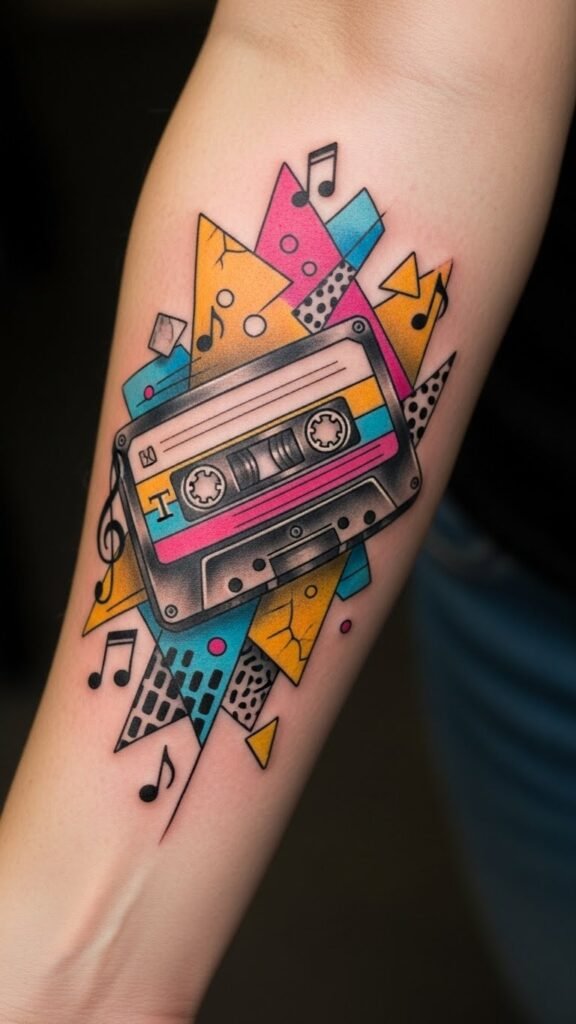 Positioned on the forearm, it becomes a daily reminder of the joy and individuality that these eras inspired. The cassette tape symbolizes the music that shaped memories, while the bold patterns evoke the carefree spirit and vibrant aesthetics of the time.