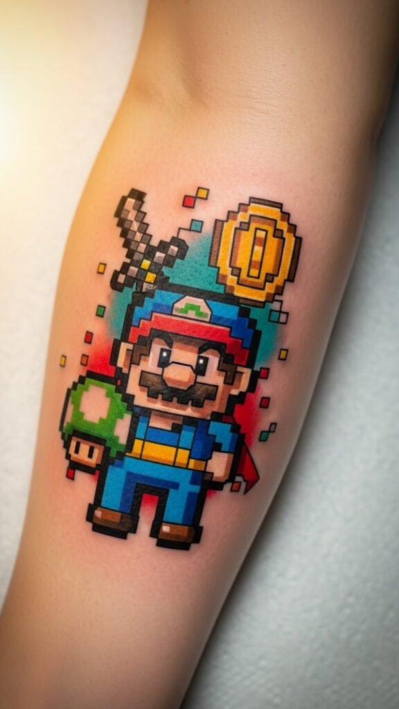 This tattoo symbolizes a deep connection to childhood memories and the joy of gaming adventures.