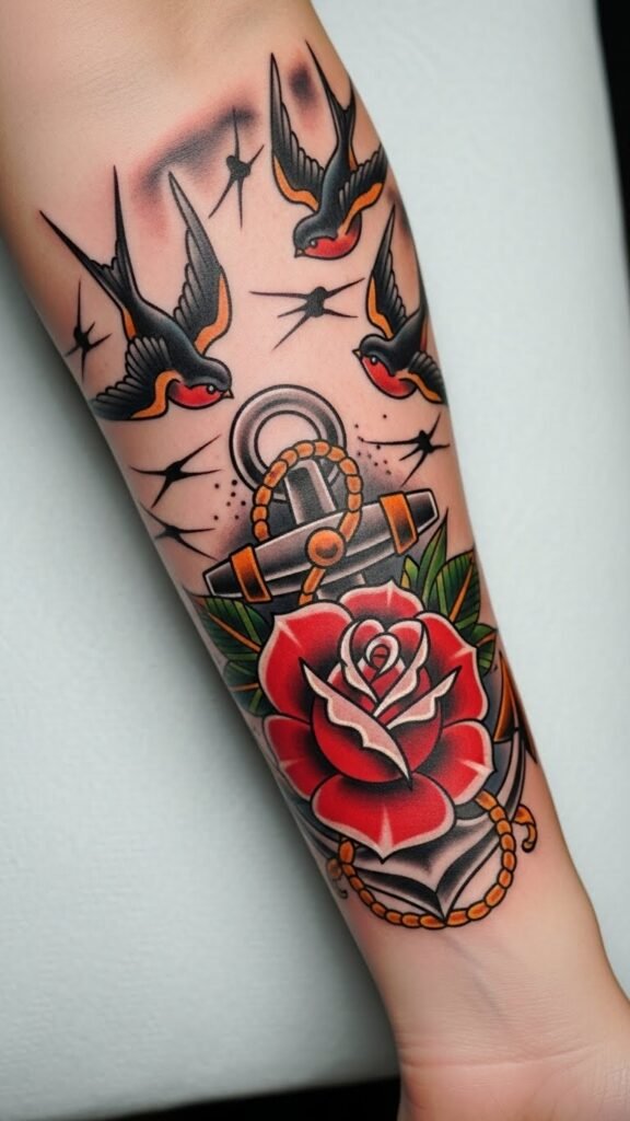 The rose symbolizes love and beauty, while the anchor represents stability and hope, creating a harmonious contrast that speaks to the balance of passion and perseverance.