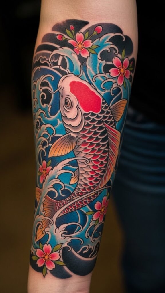 The koi fish symbolizes perseverance and strength, representing the journey of overcoming challenges. The waves reflect the struggles faced along the way, while the cherry blossoms signify the beauty of life and the transient nature of existence.