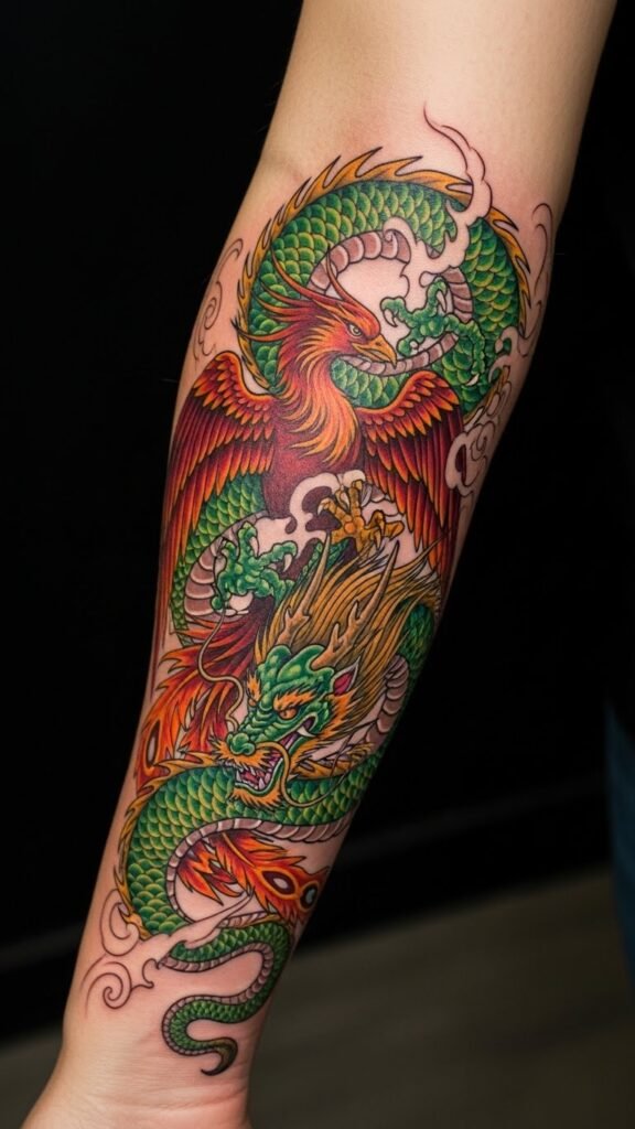 This tattoo embodies the duality of strength and rebirth, with the dragon symbolizing power and wisdom, while the phoenix represents renewal and transformation.