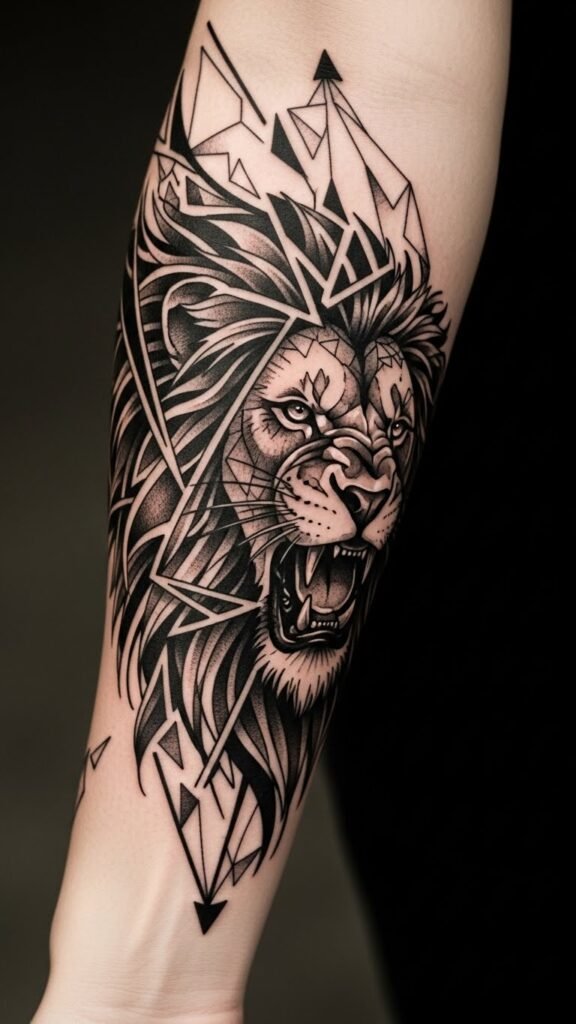 The intricate geometric patterns enhance the lion’s raw energy, creating a harmonious blend of nature and artistry that resonates deeply with the wearer’s identity.
