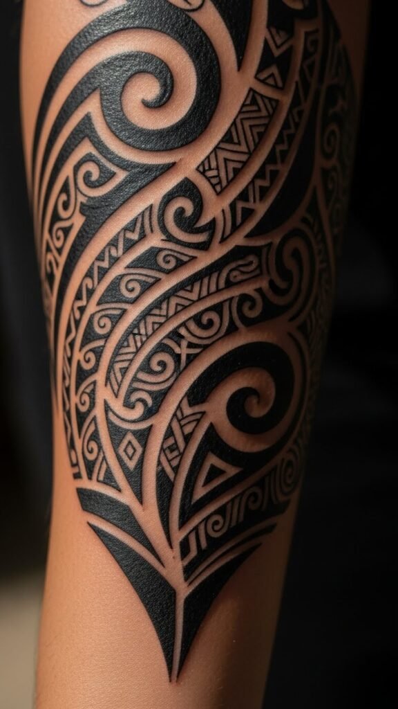 This tattoo on the forearm captures the essence of cultural storytelling and personal identity through its intricate tribal patterns. Each curve and line isn’t just a design but holds deep cultural significance, representing strength and unity.