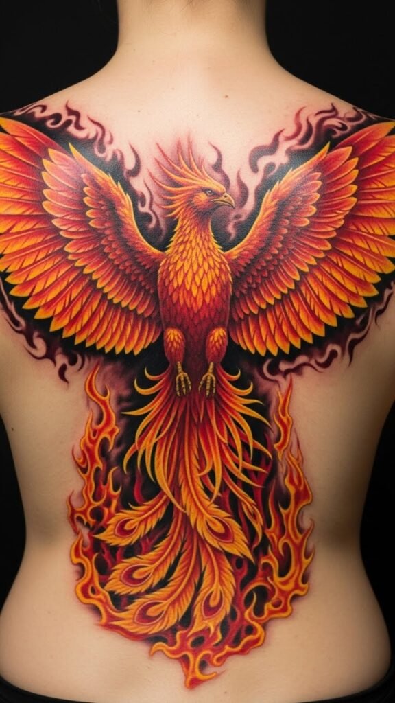 Positioned on the upper back, it serves as a reminder of overcoming challenges and rising anew, making it a powerful statement piece.
