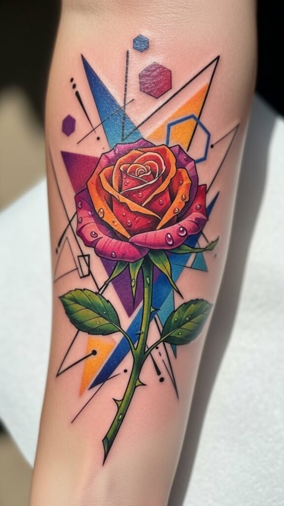 This tattoo design captures the essence of personal stories and emotions. The rose, with its deep red hue, symbolizes strength and resilience, reflecting the wearer’s journey through challenges.