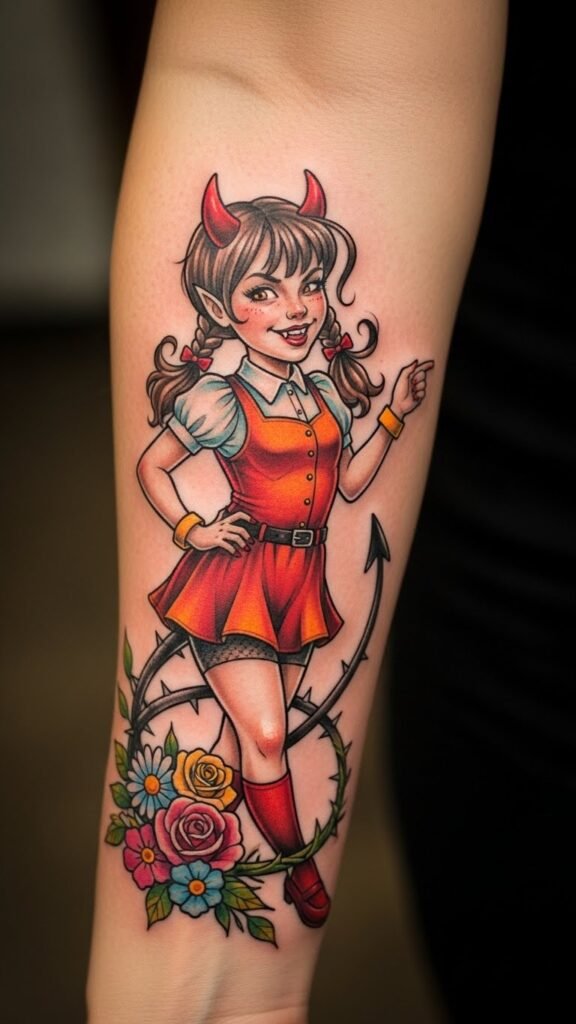 This tattoo symbolizes a playful rebellion against the mundane, capturing the essence of embracing one’s unique spirit while flirting with the darker aesthetic.