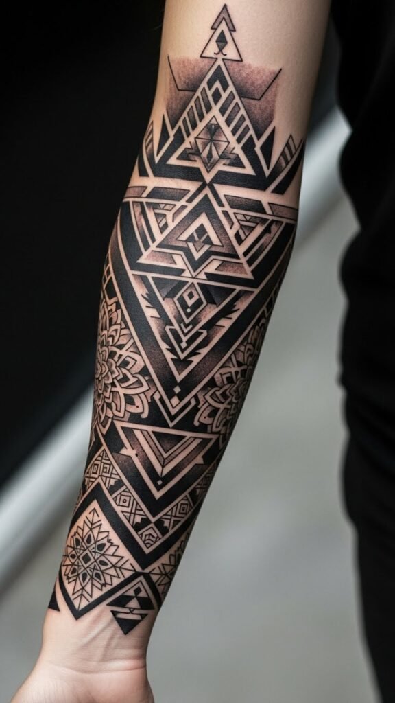 This tattoo embodies individuality and freedom through its striking geometric shapes.