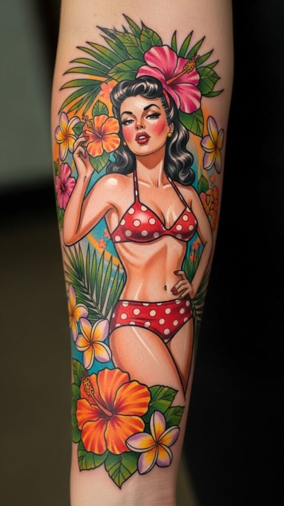 This tattoo embodies the spirit of freedom and individuality, with the vintage pinup symbolizing empowerment and confidence, while the retro florals represent growth and vibrancy.