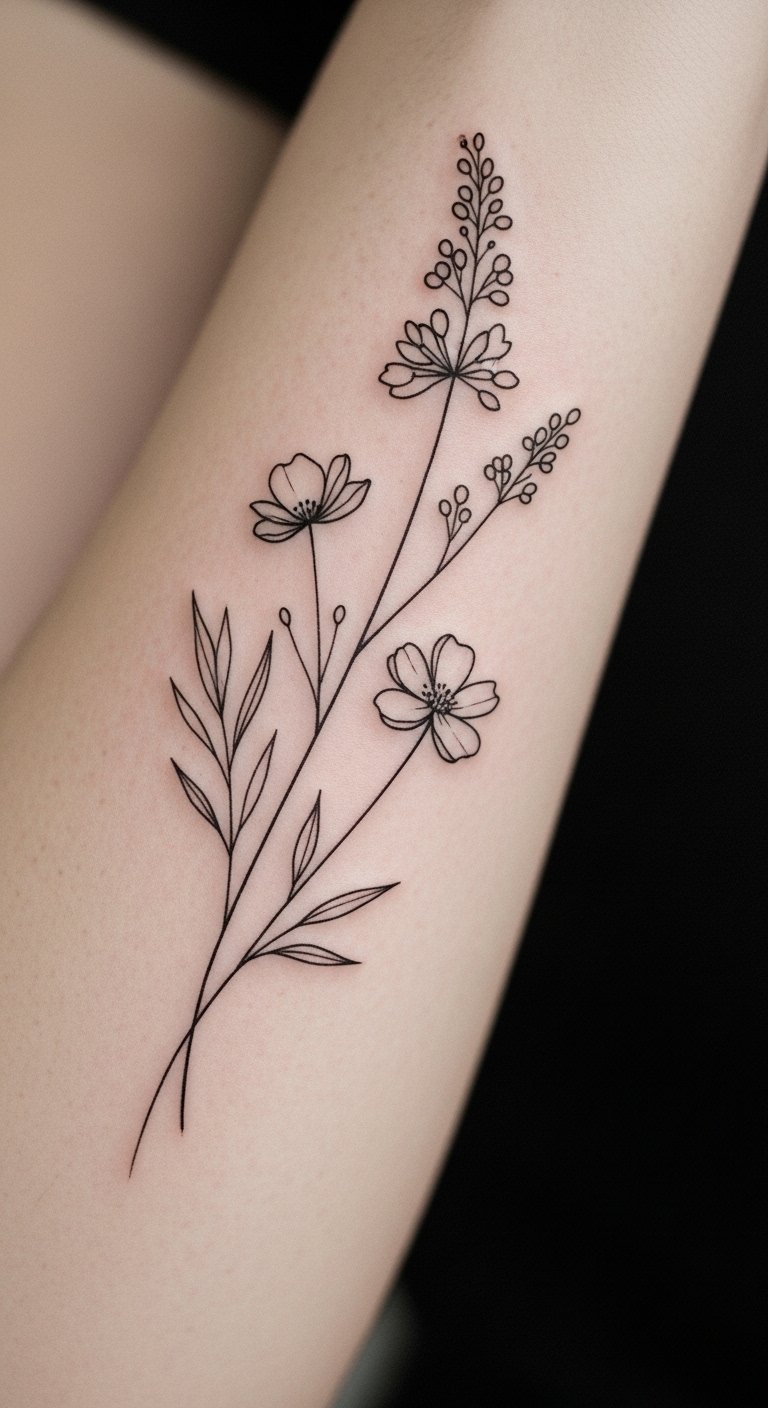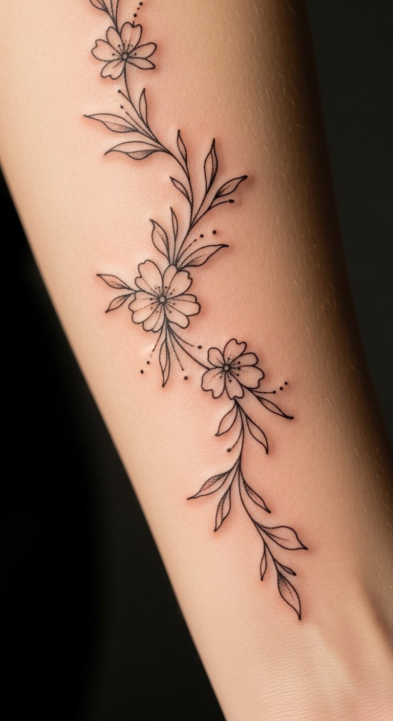 This tattoo symbolizes beauty and resilience, representing the strength found in vulnerability. The forearm placement allows for easy visibility, making it a personal statement of individuality and grace. The minimalist design speaks to a modern aesthetic, while the floral motif evokes a sense of nature and growth. This tattoo not only enhances the aesthetic vibe but also carries emotional depth, serving as a reminder of personal journeys and the beauty in life’s fleeting moments.