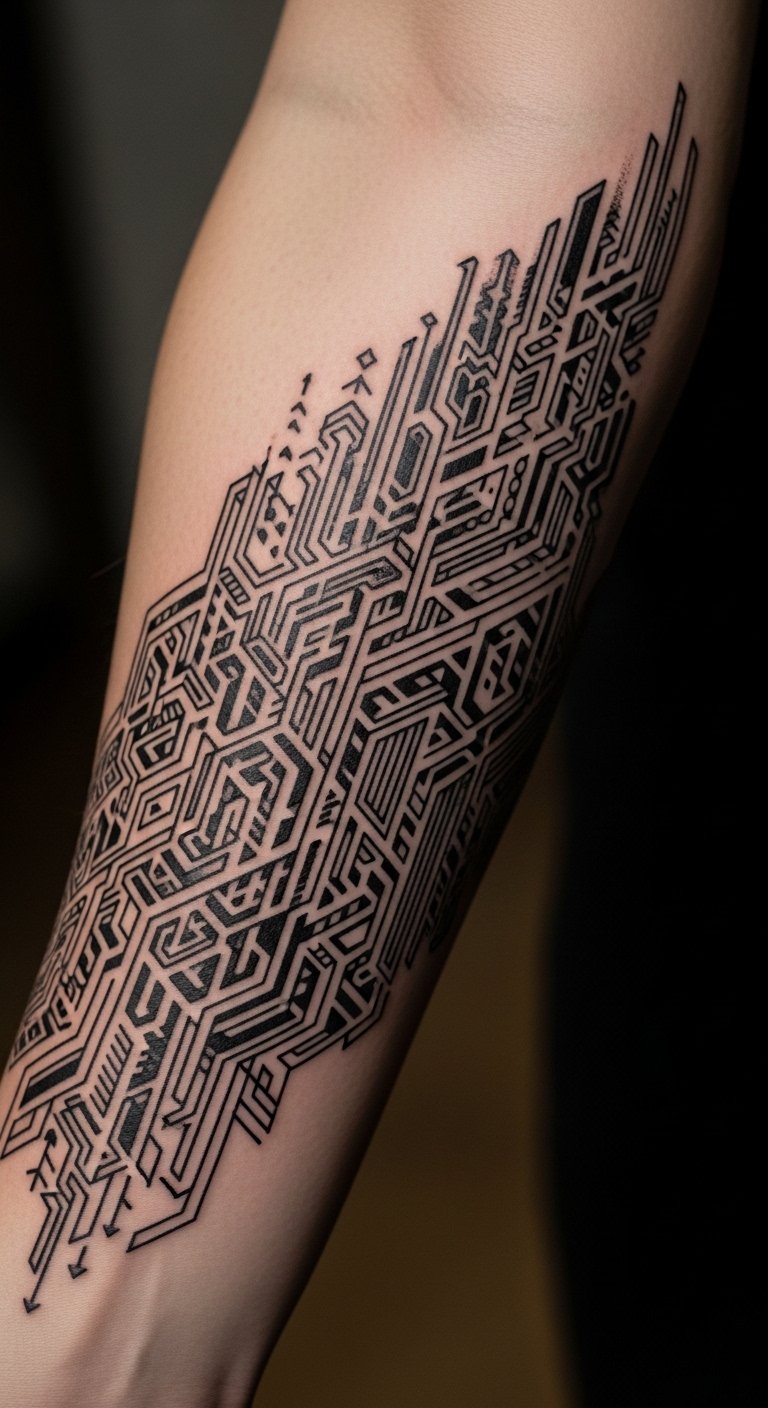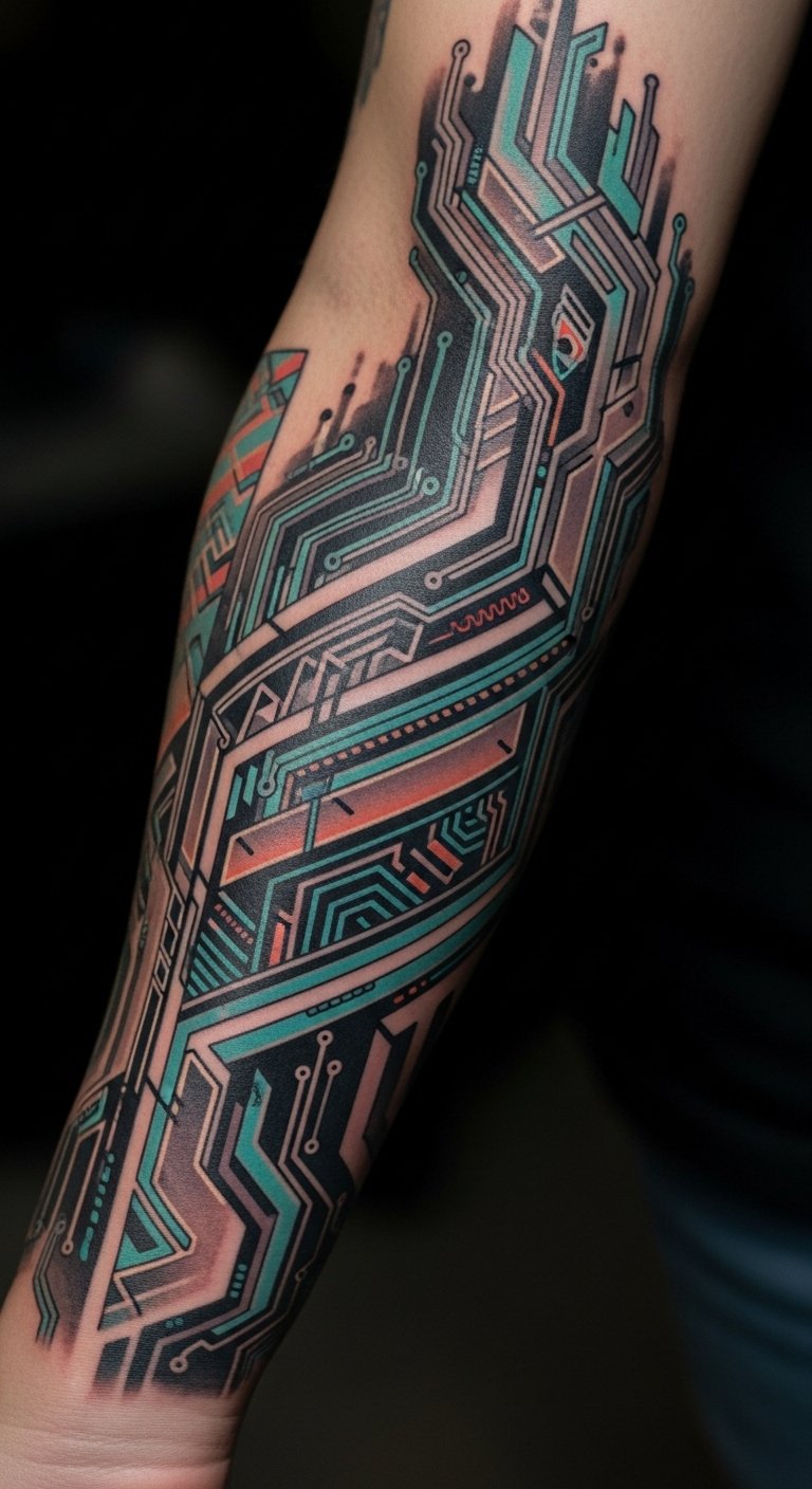 This tattoo, placed on the forearm, symbolizes the intersection of individuality and technology, representing a bold statement of freedom and innovation.