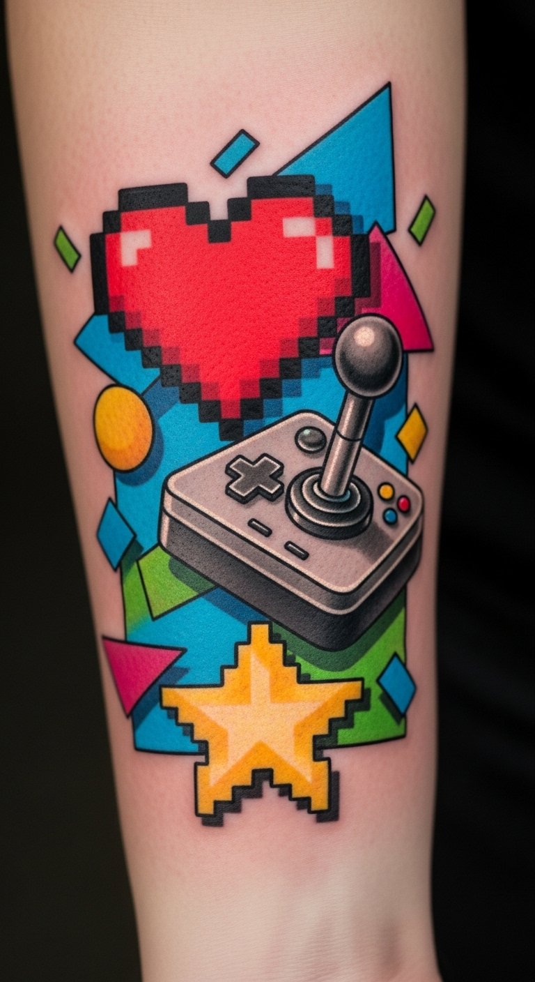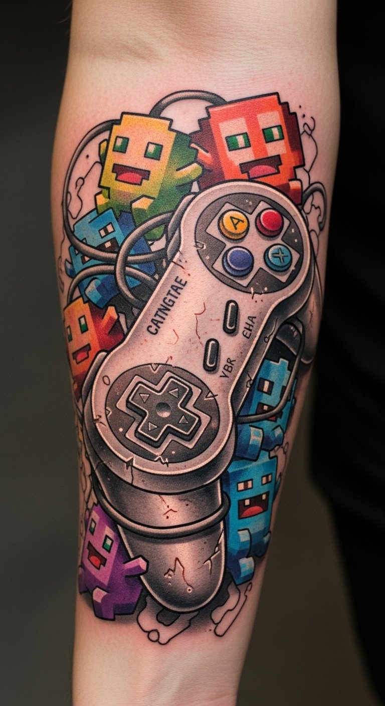 Positioned on the forearm, it serves as a constant reminder of joyous gaming adventures and the digital revolution.