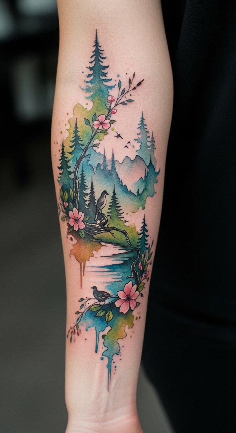 Positioned on the forearm, it serves as a constant reminder of one’s journey and connection to the natural world, allowing the wearer to share their story subtly.