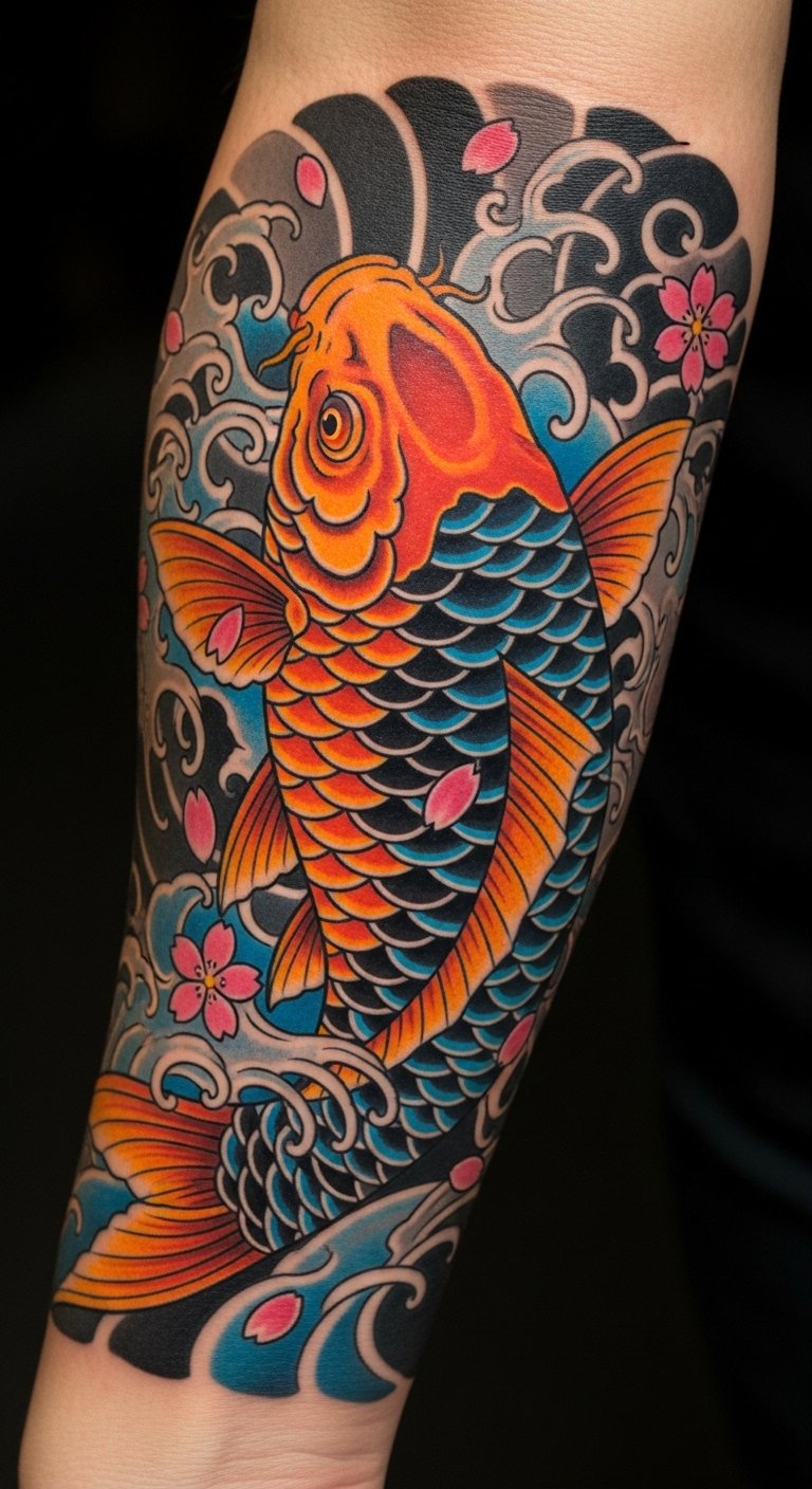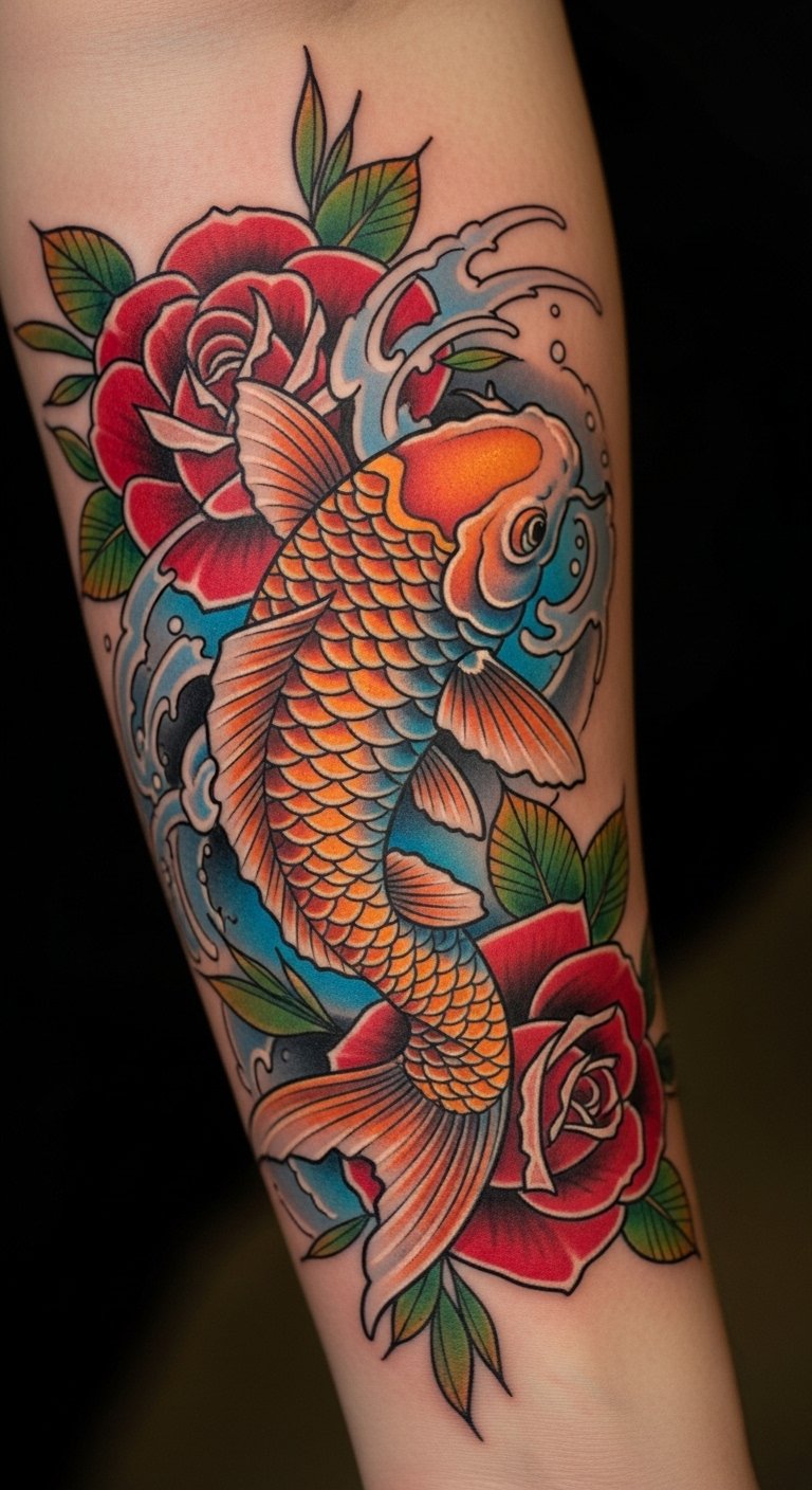This tattoo symbolizes perseverance and transformation, echoing the koi’s journey through adversity to emerge stronger.