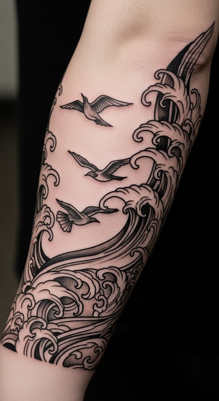 This tattoo symbolizes freedom and the beauty of life’s journey, with the waves representing the ebb and flow of experiences while the birds embody aspirations taking flight.