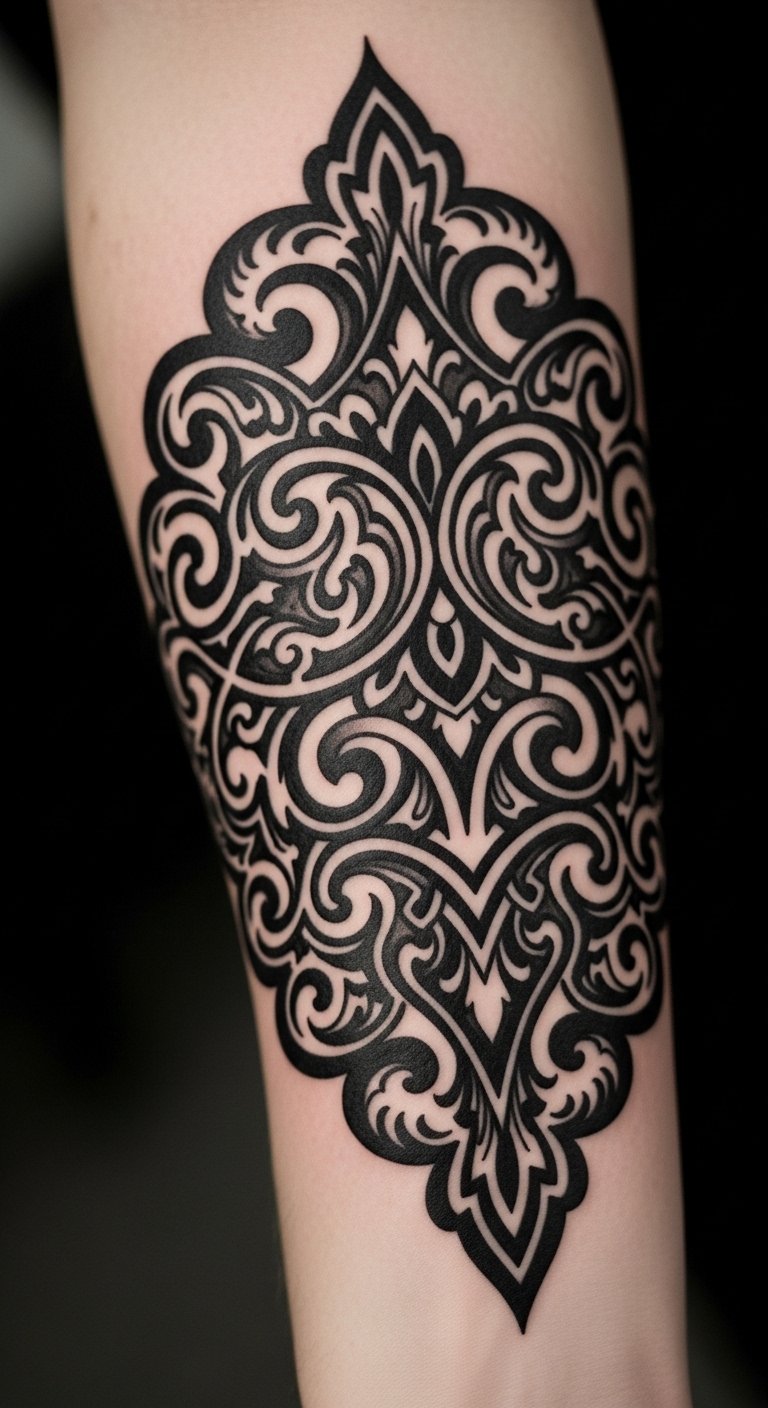 This ornamental blackout tattoo on the forearm symbolizes personal freedom and identity, merging bold artistic expression with deep meaning.