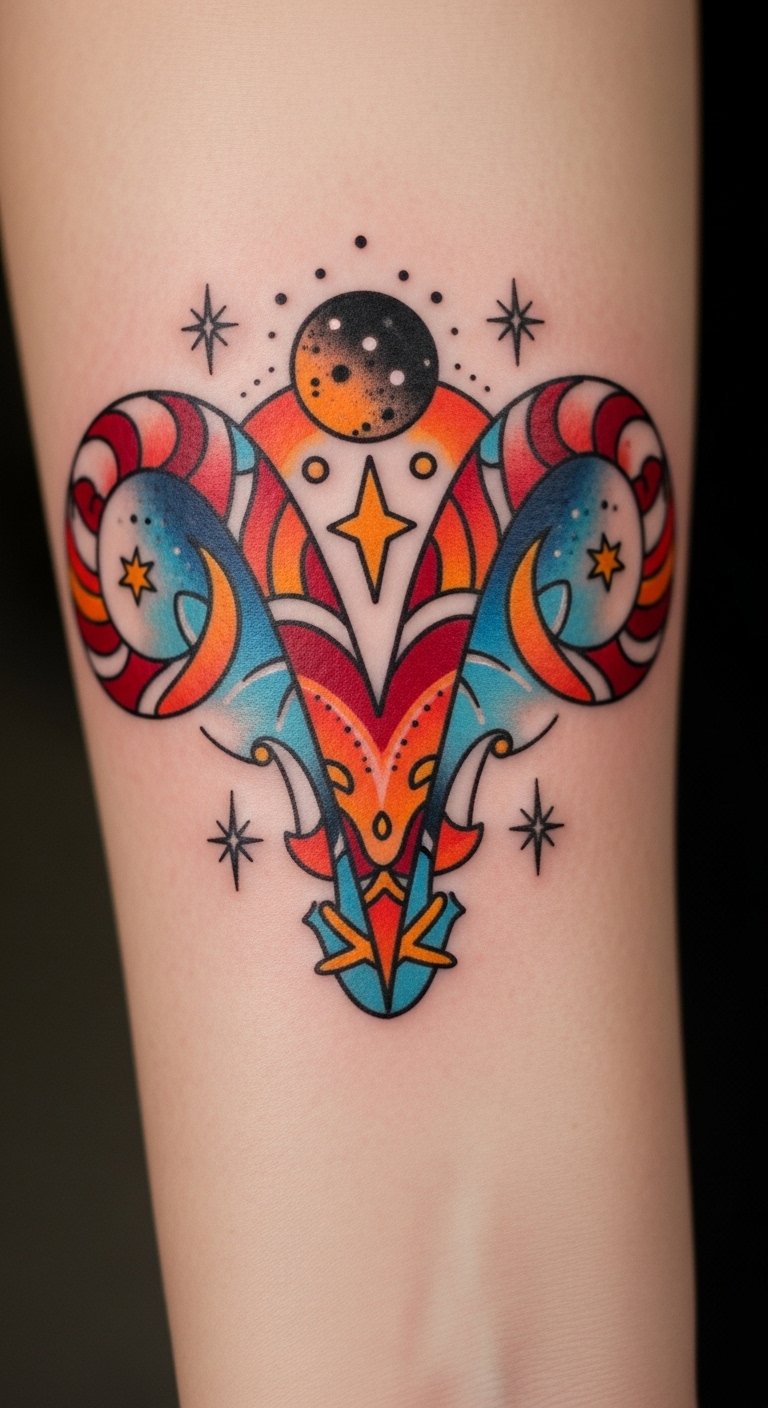This Aries tattoo embodies the fiery spirit and adventurous nature associated with the sign.