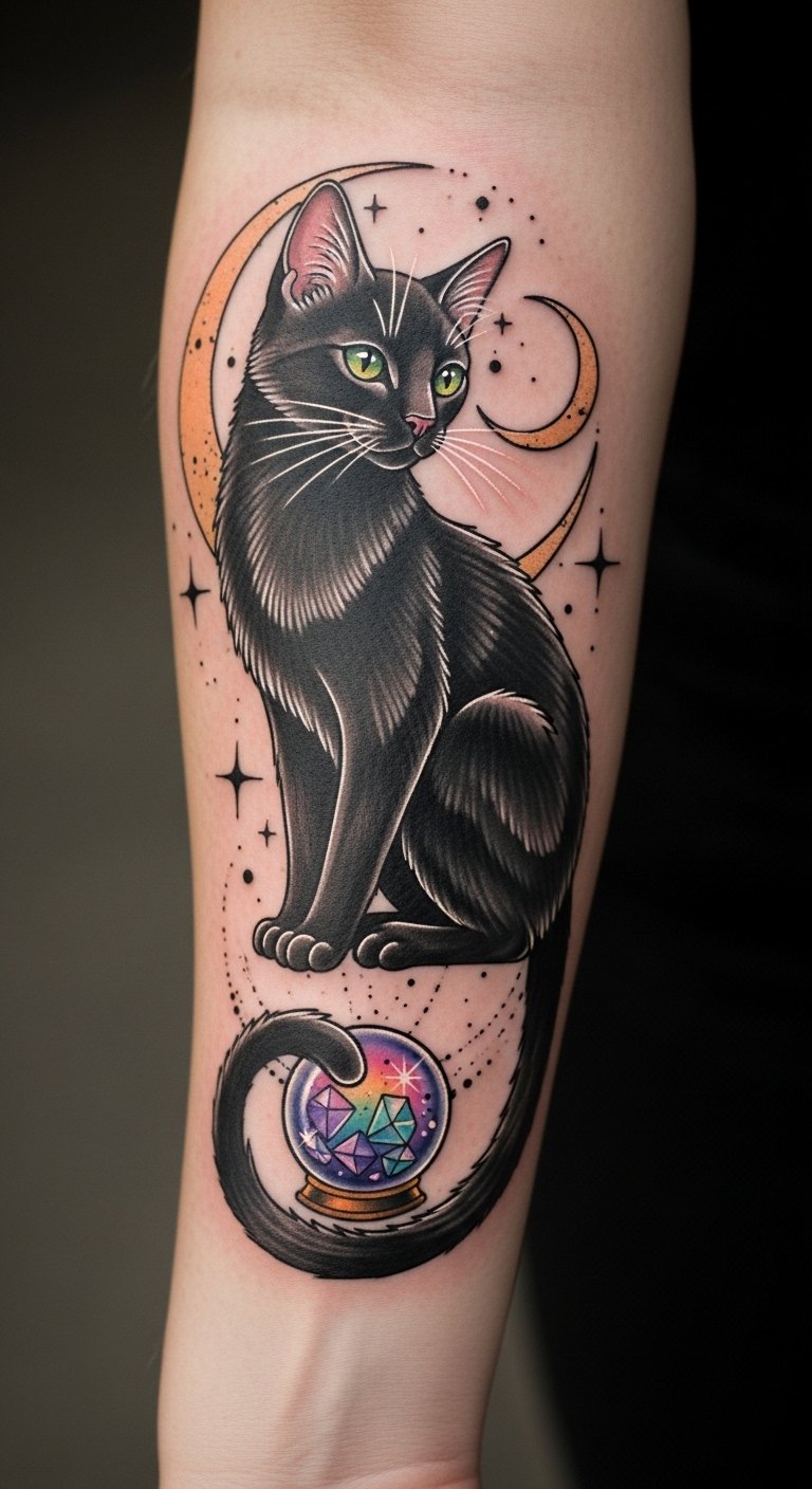 This tattoo symbolizes intuition, mystery, and the protection believed to be offered by black cats, particularly on a day steeped in superstition like Friday the 13th.