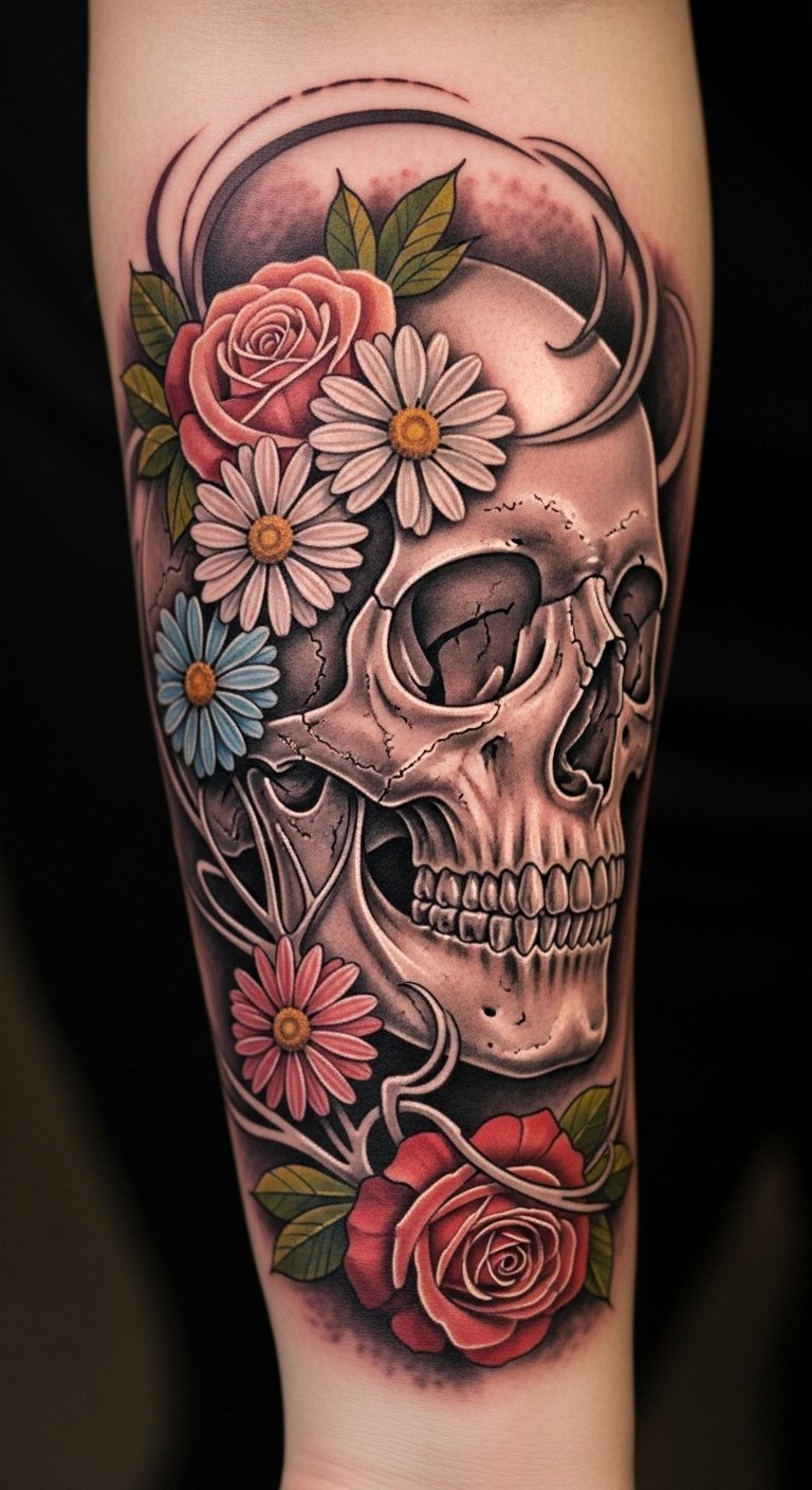 This striking tattoo design captures the duality of life, showcasing the skull as a representation of mortality and transformation, while the flowers signify growth and renewal.