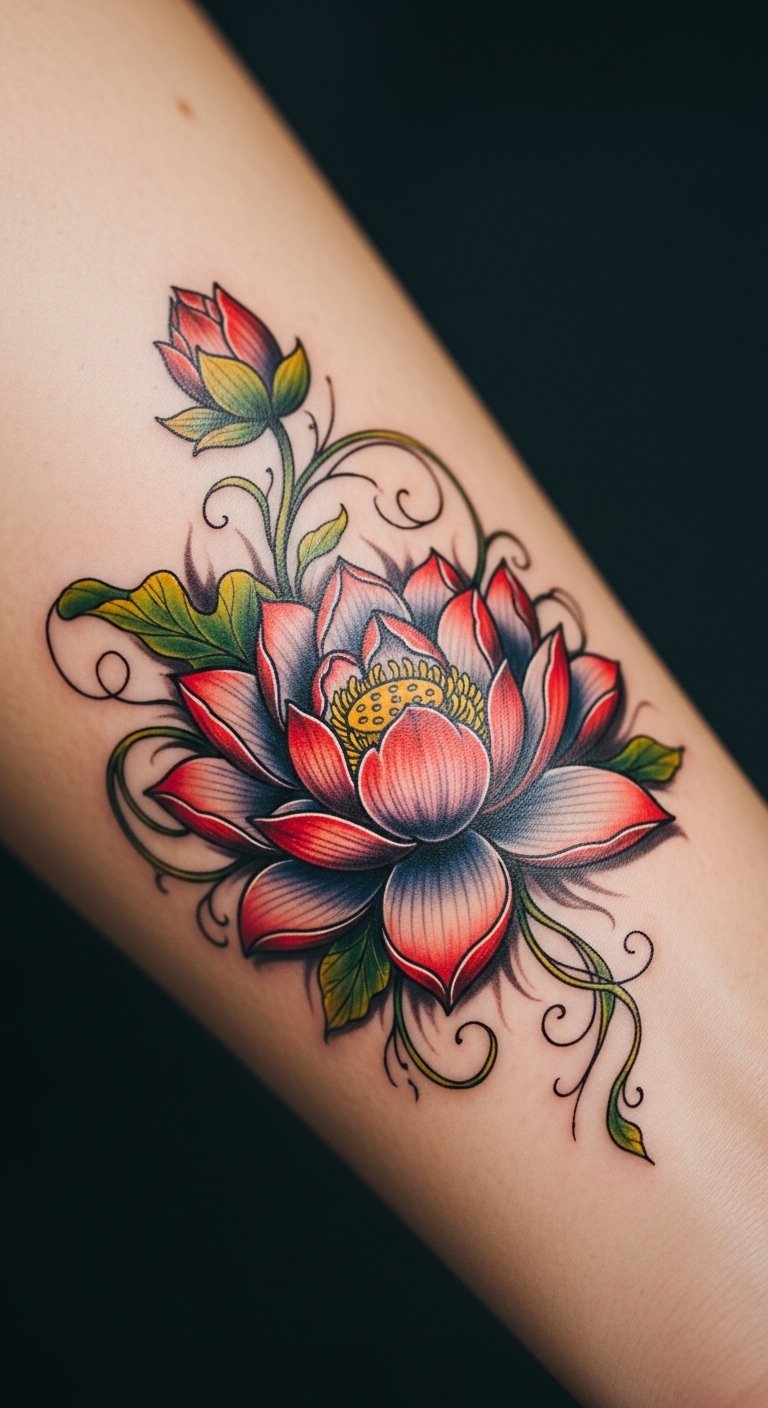 The lotus flower symbolizes purity, rebirth, and spiritual awakening, while the vines represent growth and connection.