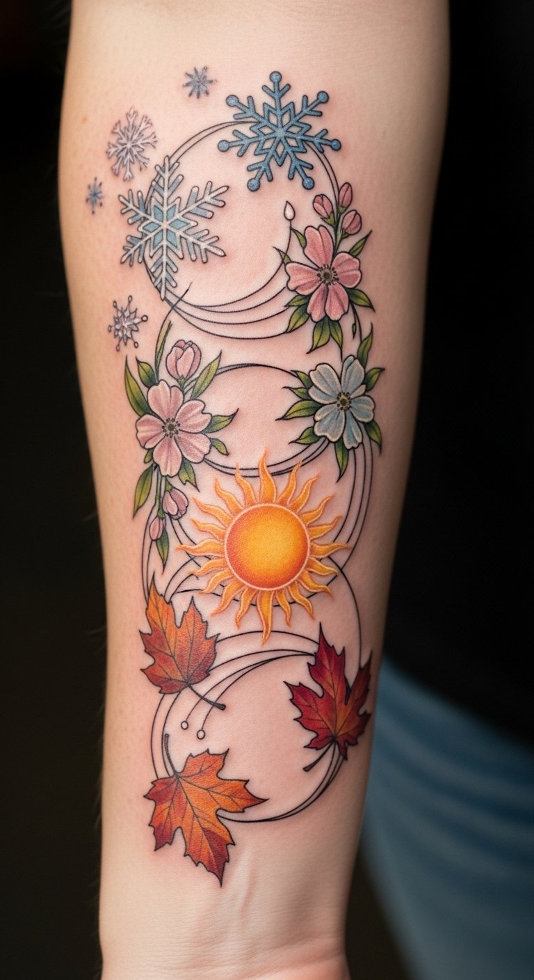 The tattoo symbolizes the cyclical nature of life and the beauty found in each season, reflecting personal growth and change.
