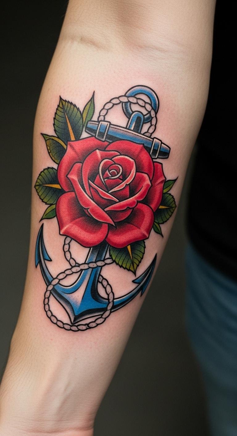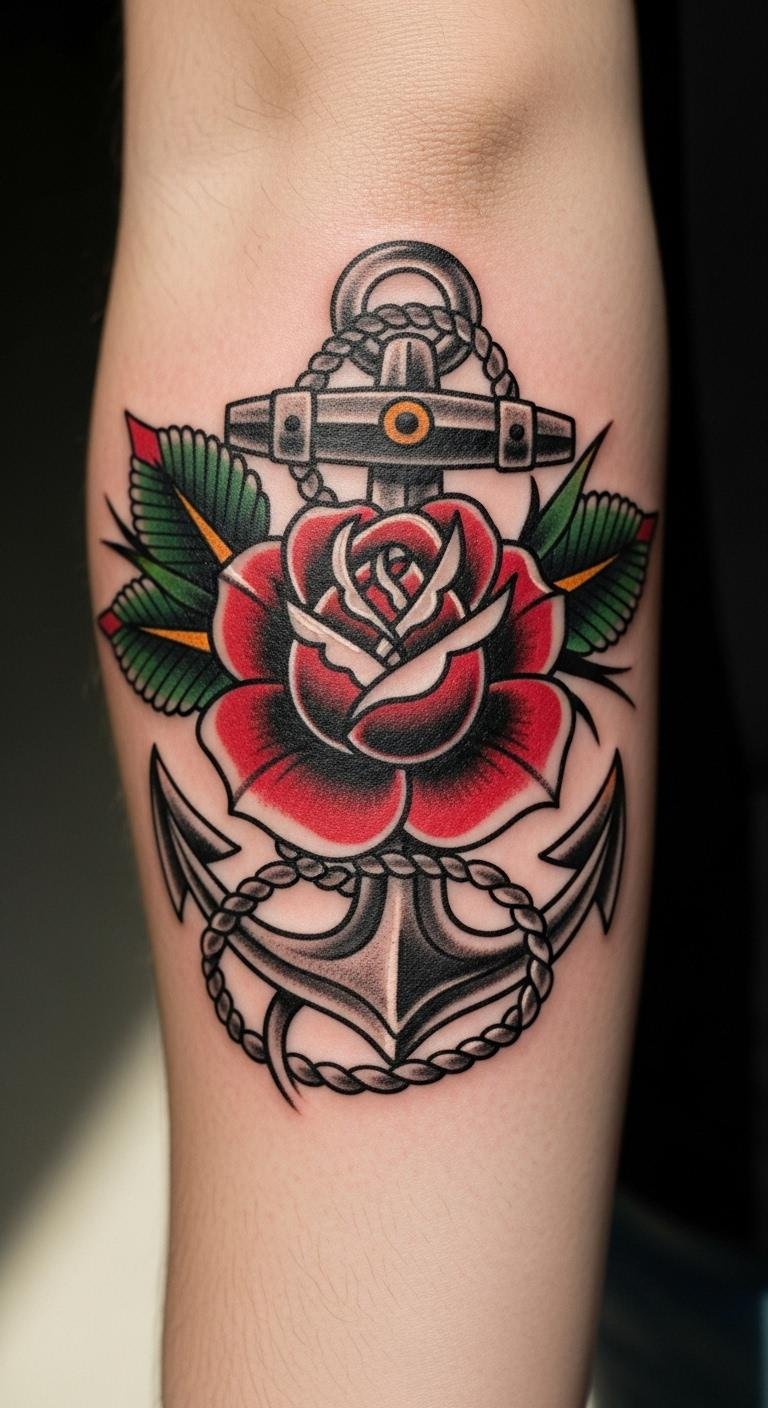 The juxtaposition of the rose and anchor not only creates a striking visual impact but also evokes a sense of nostalgia, connecting the wearer to the timeless themes of American traditional tattoo artistry.