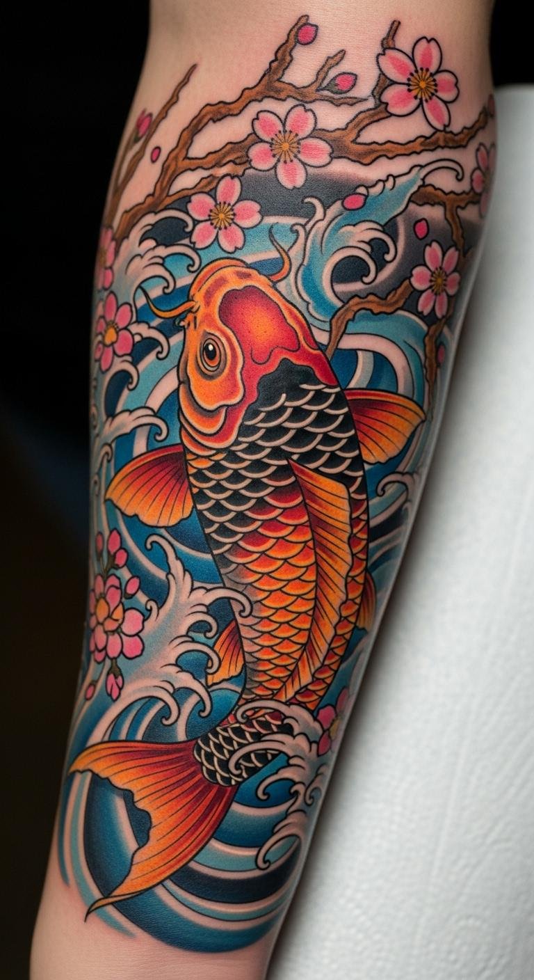 The koi fish symbolizes perseverance and strength, representing the journey of overcoming obstacles.