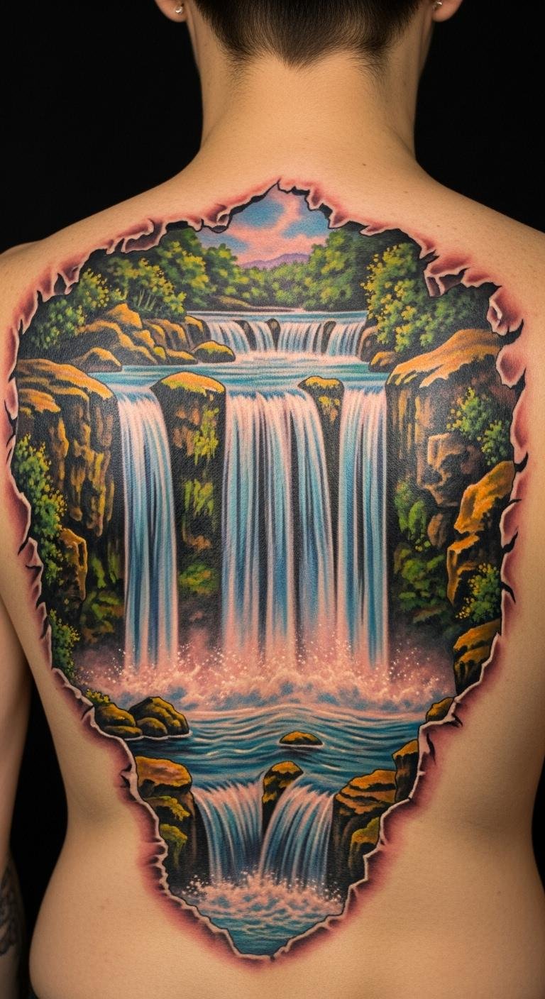 Positioned on the upper back, it serves as a reminder of the strength that lies within, while the waterfall’s movement evokes a sense of peace and freedom.
