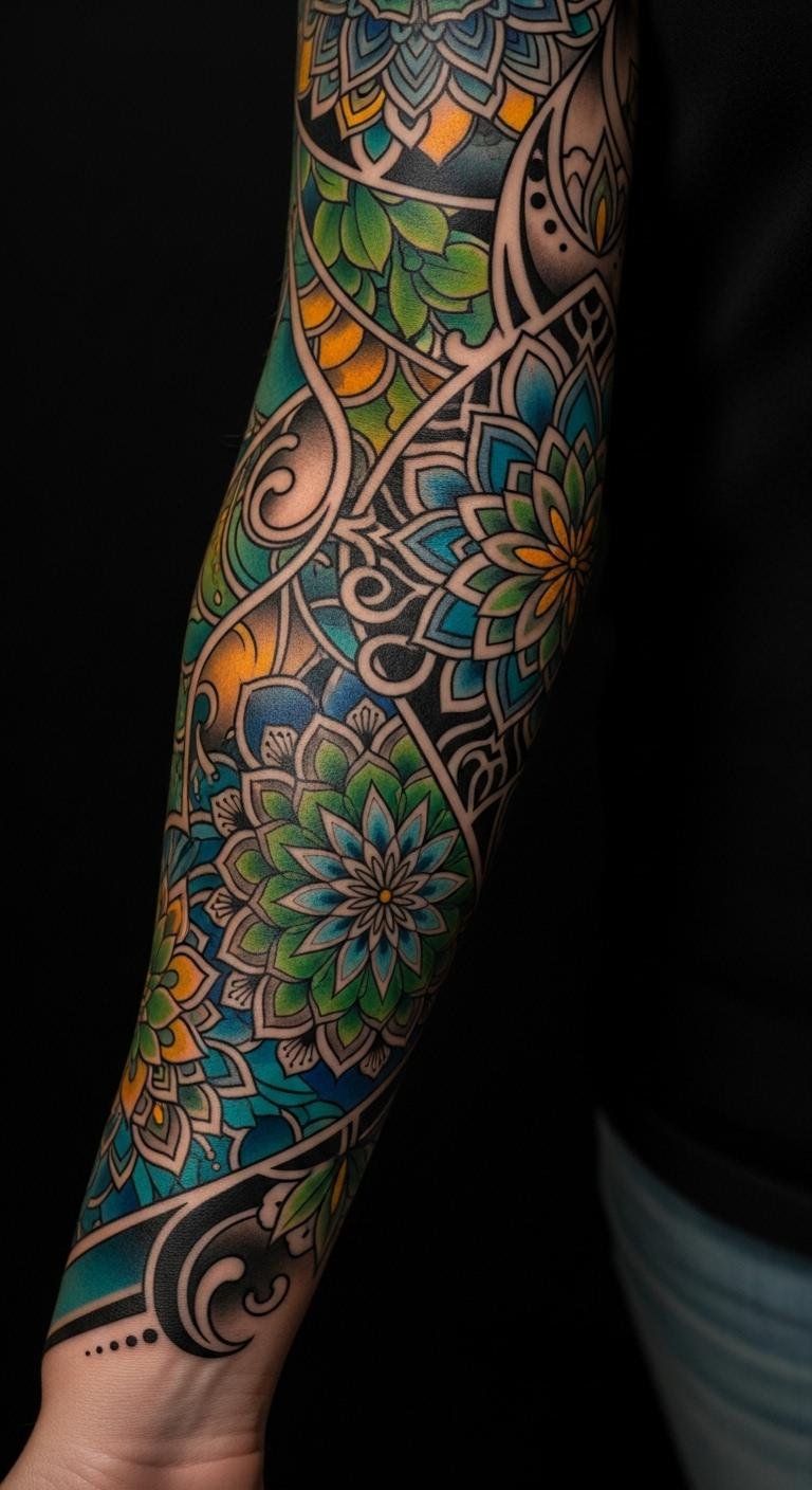 This tattoo design symbolizes the interconnectedness of life and personal growth, with mandalas representing unity and wholeness, while the floral patterns signify beauty and resilience.