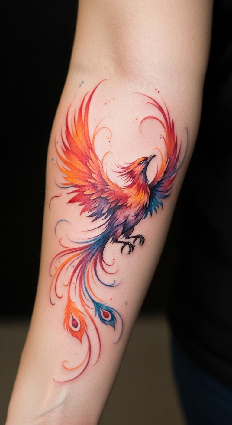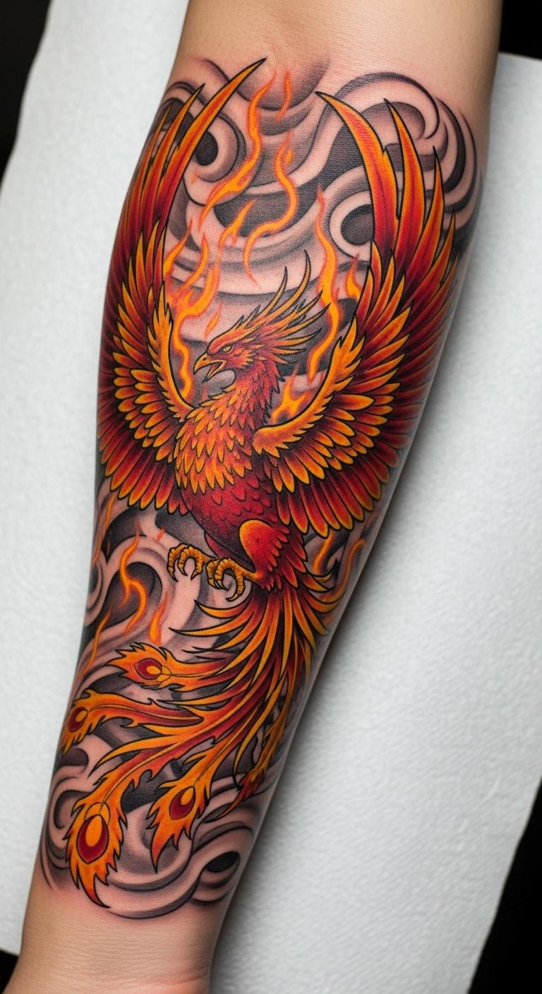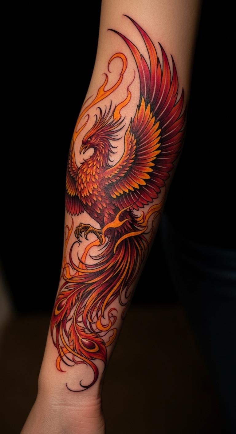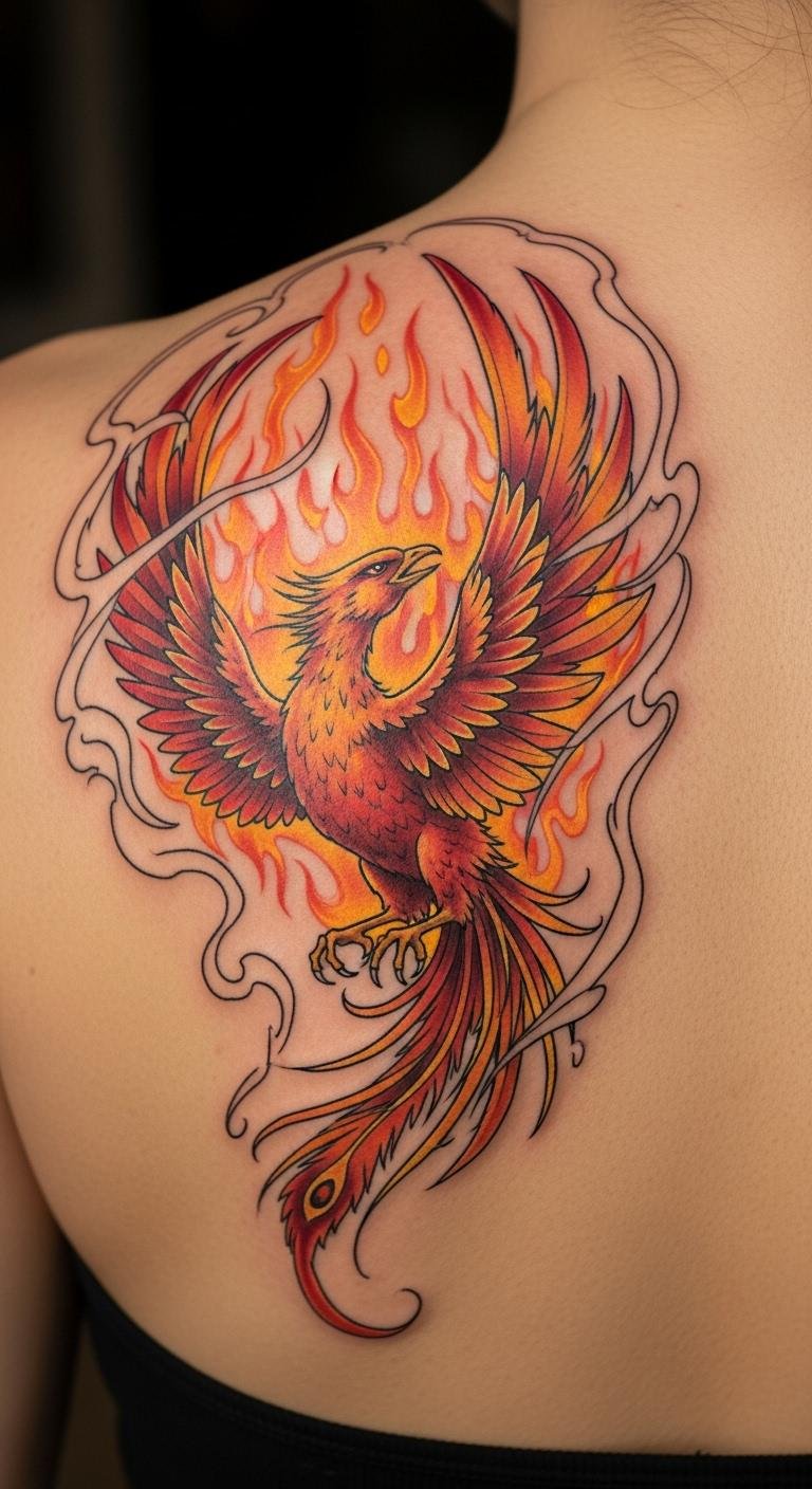 This phoenix tattoo symbolizes rebirth and resilience, representing personal growth and transformation.