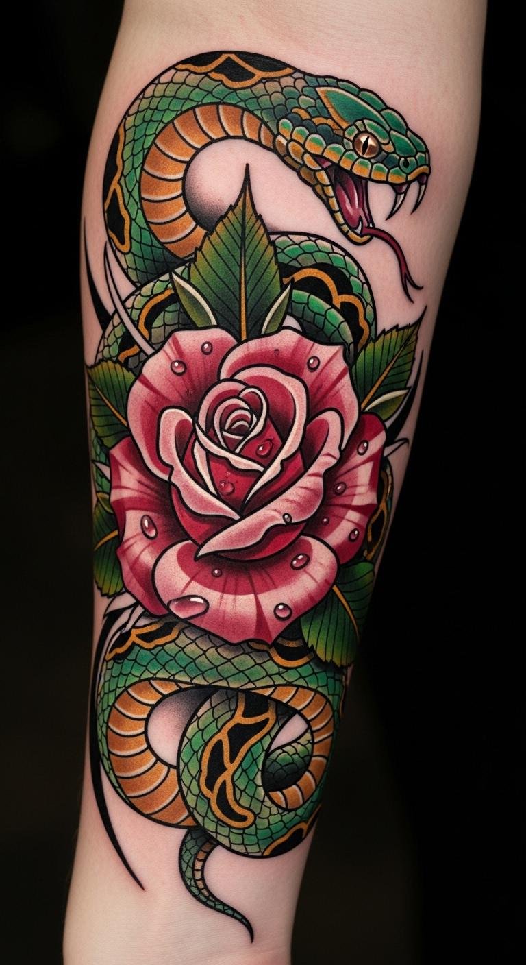 This tattoo symbolizes the duality of beauty and danger, with the rose representing love and passion, while the snake embodies transformation and wisdom.