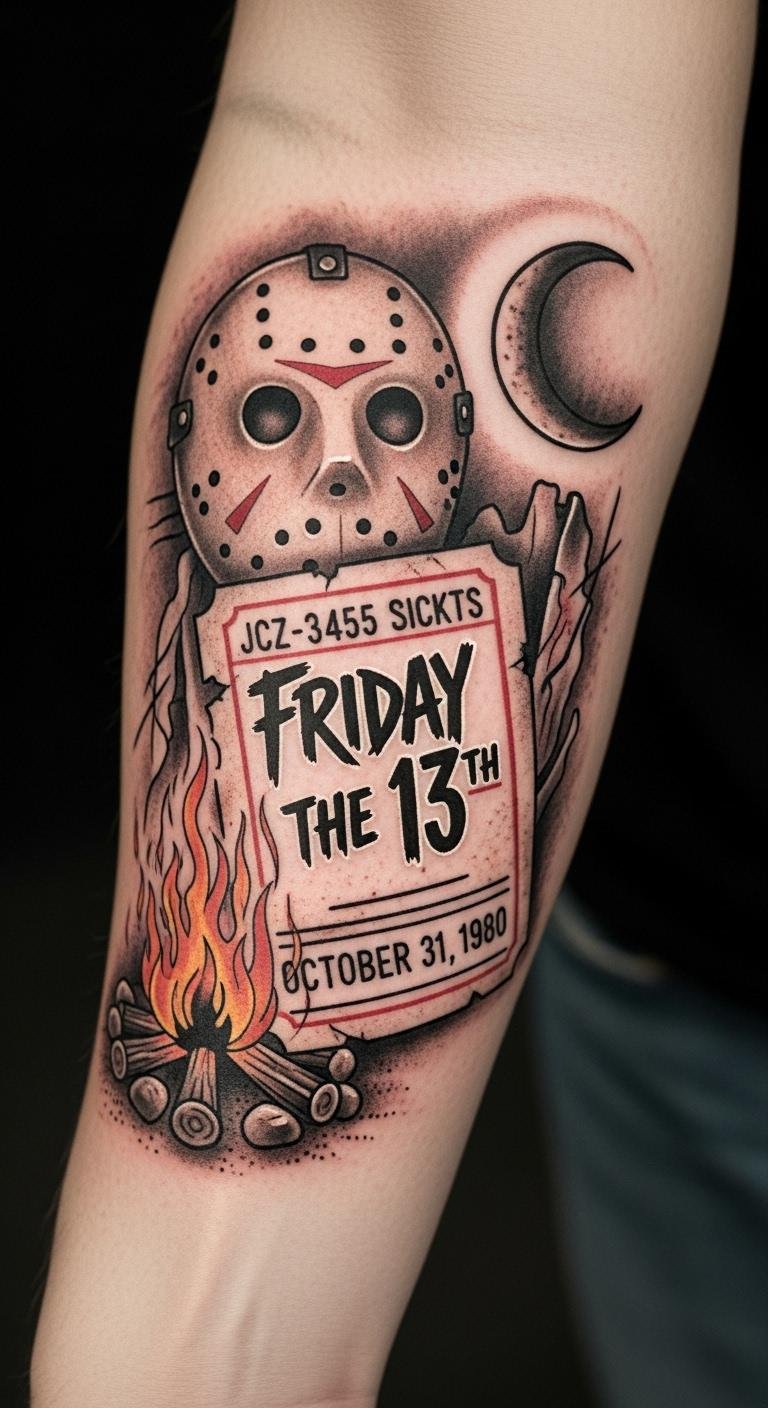 This tattoo symbolizes a connection to the rich lore of Friday the 13th, encapsulating the thrill and community surrounding horror film fandom.