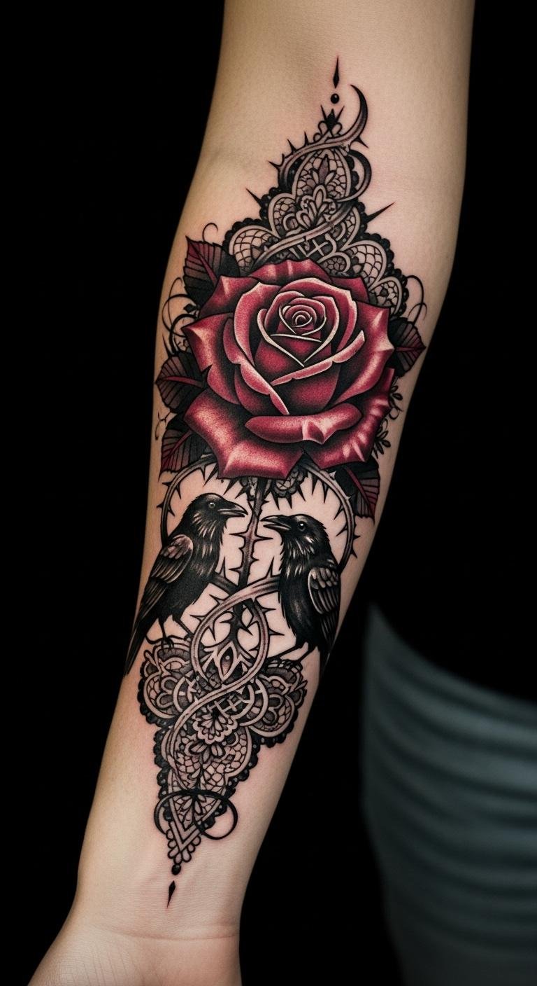 The gothic rose signifies passion and resilience, while the thorns remind us of the challenges that accompany love. The ravens add an element of mystery and wisdom, evoking a sense of strength in solitude.
