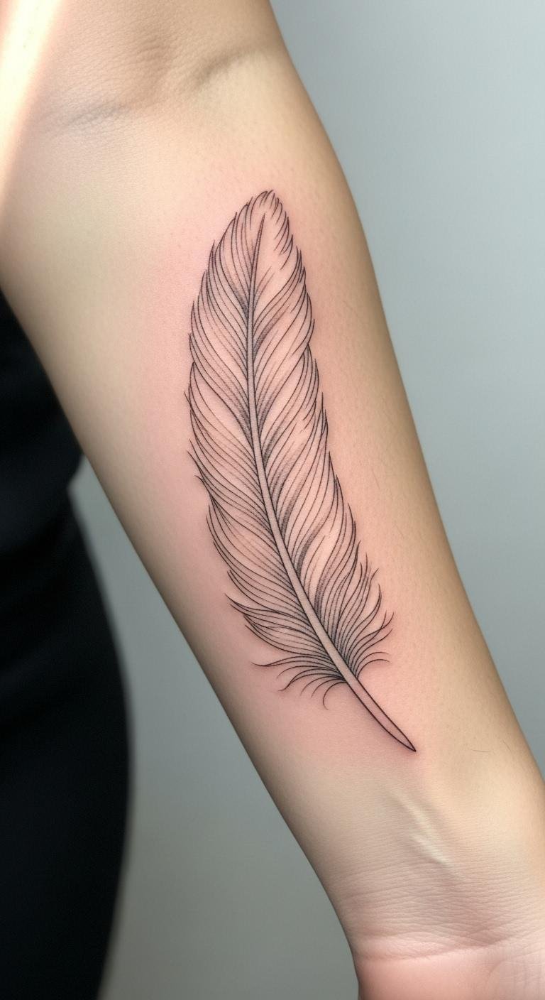 The feather symbolizes freedom, lightness, and the ability to rise above challenges. Its placement on the inner forearm allows for easy visibility, serving as a daily reminder of personal growth and resilience.