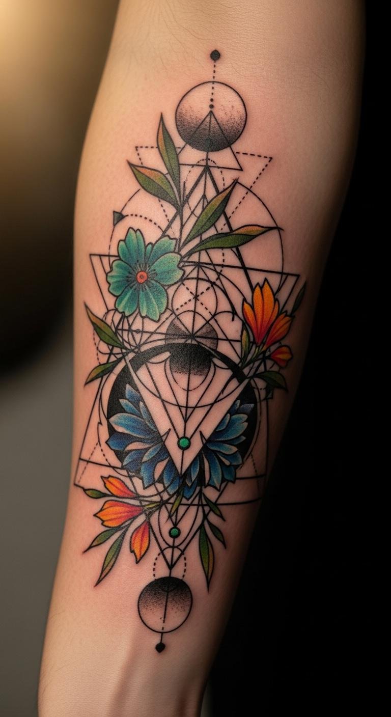 This tattoo embodies the fusion of nature and technology, symbolizing growth and transformation through the interplay of organic and geometric forms.