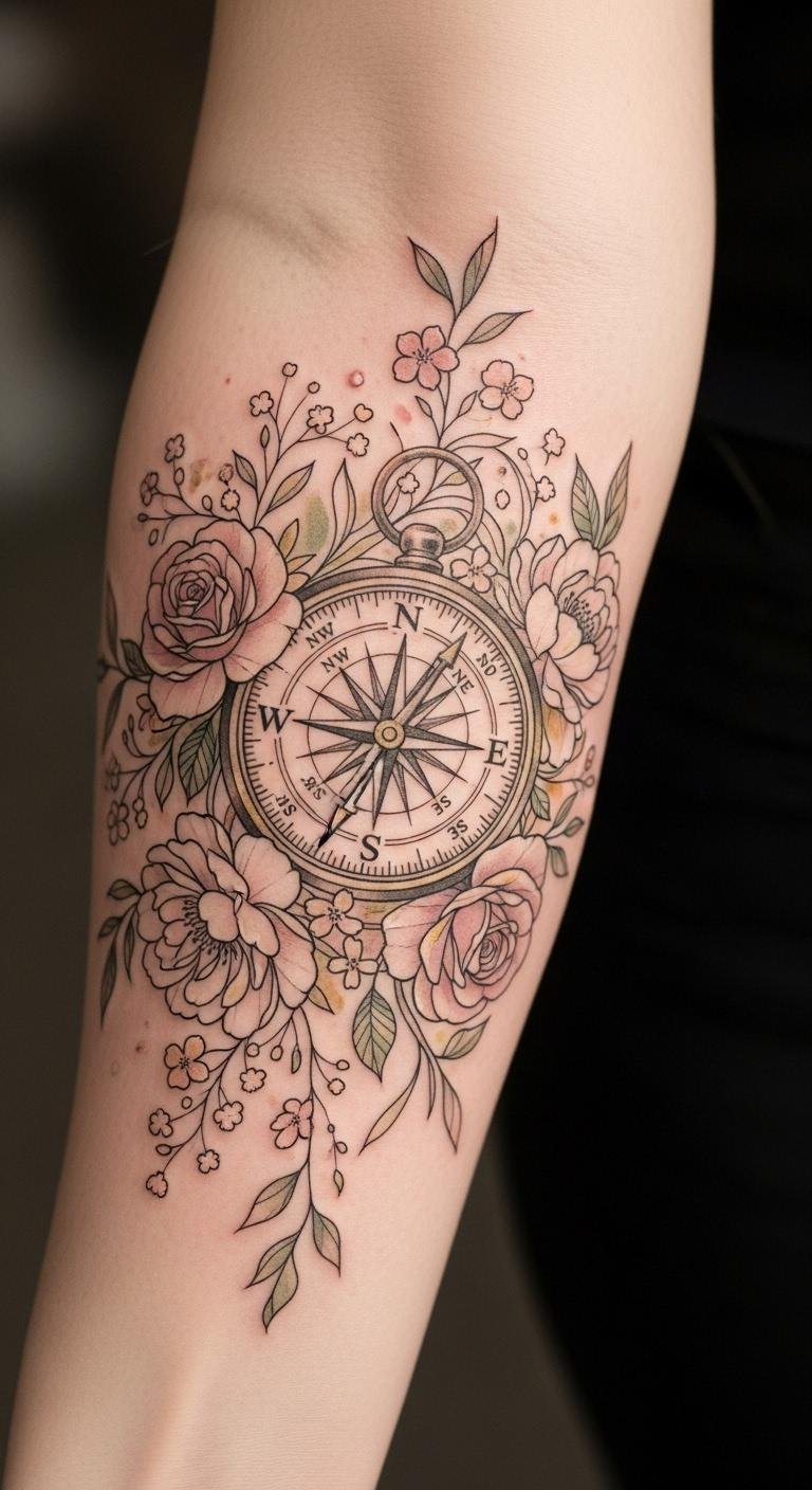 The surrounding floral patterns serve as a tribute to meaningful experiences and family heritage, intertwining with the compass to create a harmonious representation of one’s life path.