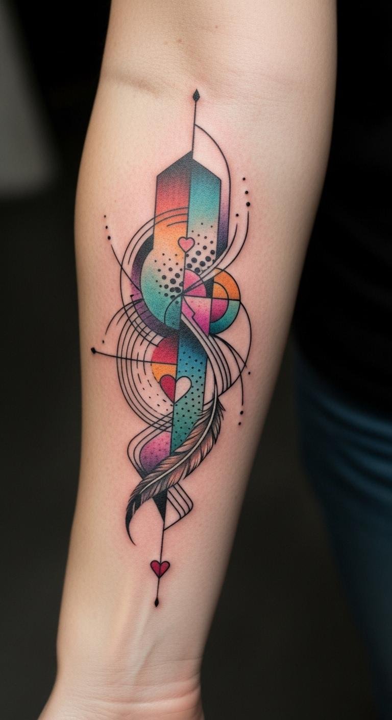 This tattoo symbolizes the balance between freedom and structure, reflecting a journey of self-discovery through abstract expression.