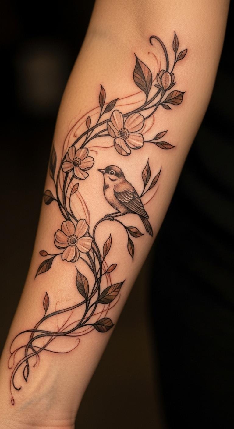 This tattoo design symbolizes the intricate bond between humanity and nature, embodying the beauty and resilience of the earth. The intertwining vines represent growth and connection, while the flowers signify the blooming potential within us all.