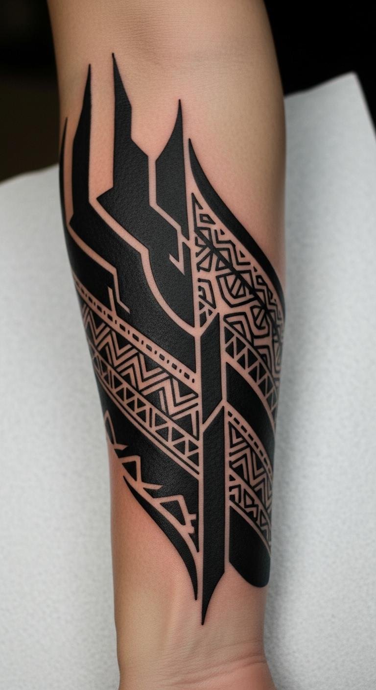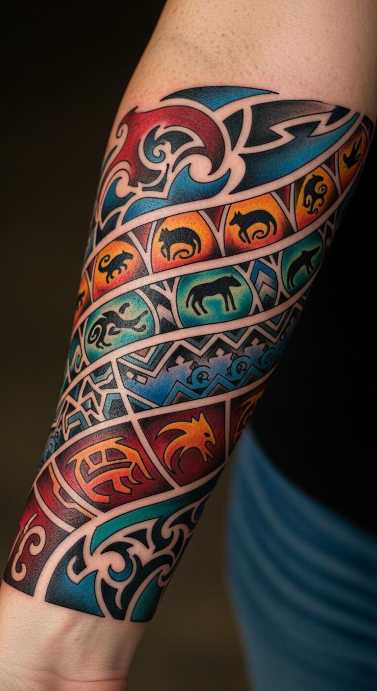 This tattoo design wraps around the forearm, symbolizing a strong connection to heritage and identity. The tribal patterns represent the wearer’s ancestry, while the storytelling elements reflect personal narratives and cultural appreciation.