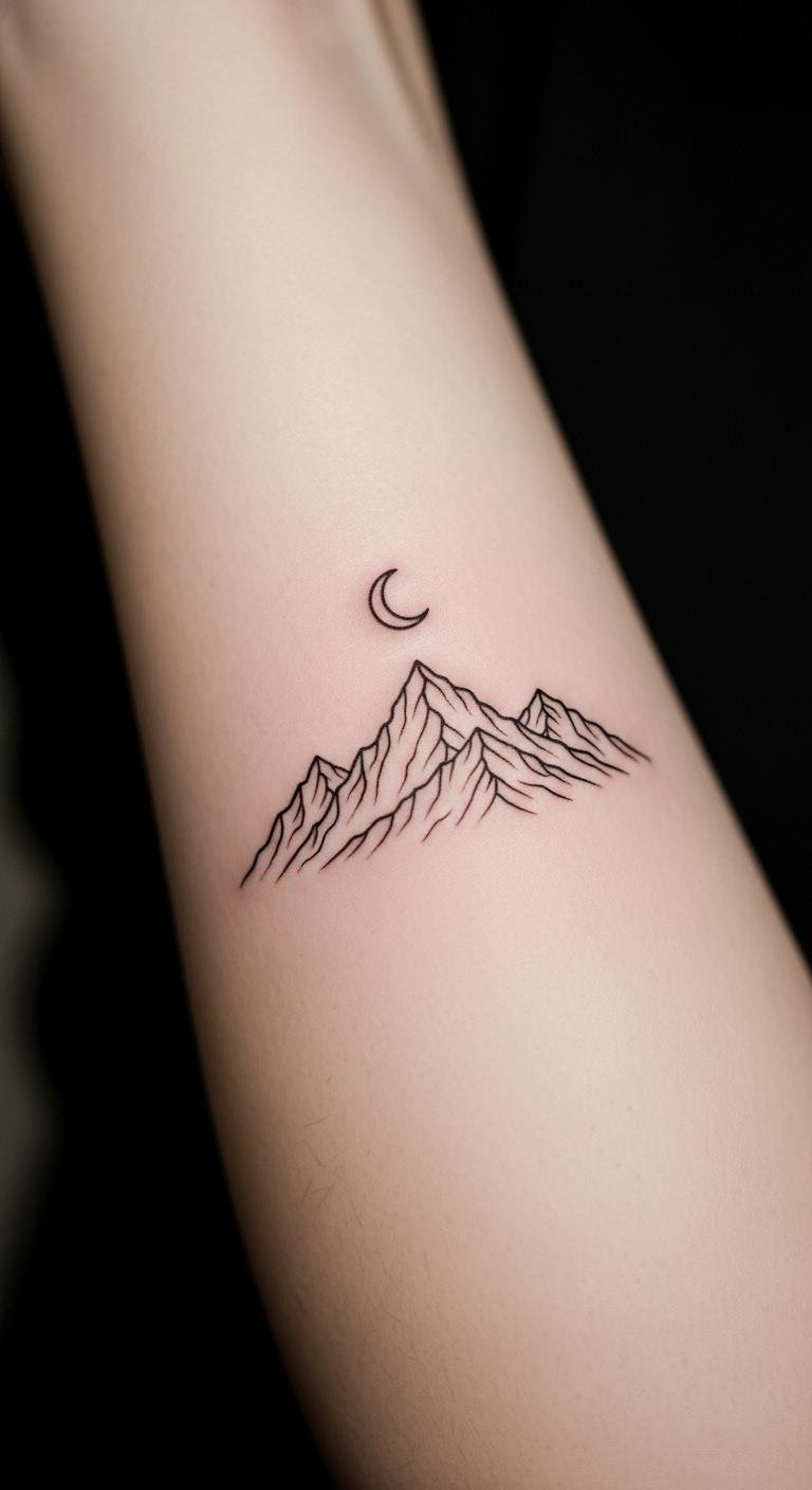 This tattoo symbolizes the journey of life, with mountains representing challenges and the crescent moon embodying hope and new beginnings.