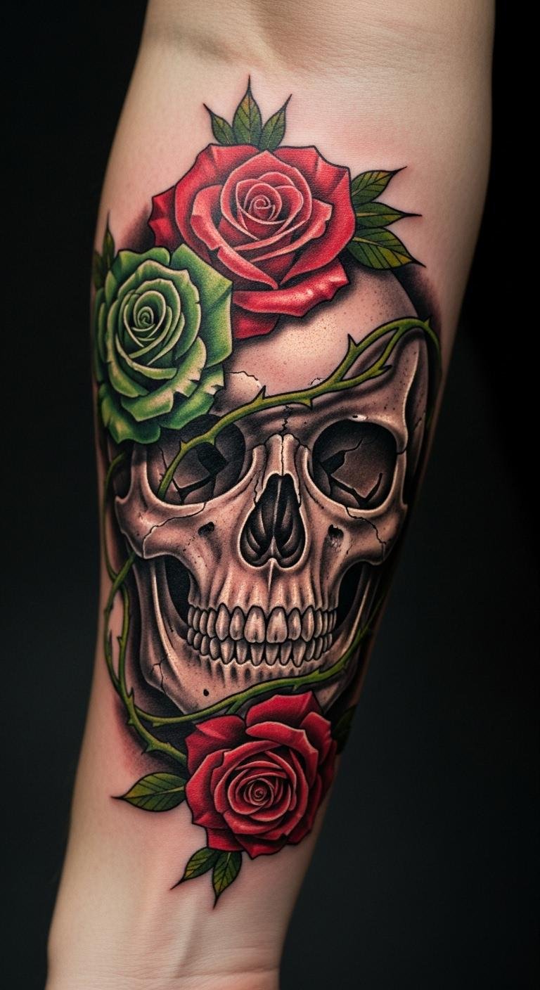 This tattoo design symbolizes the delicate balance between life and death, encapsulated in the skull and enhanced by the beauty of the roses.