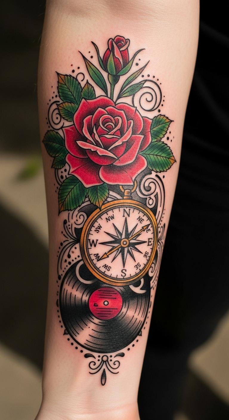 The classic rose represents love and passion, while the compass signifies direction and exploration, and the vinyl record evokes cherished memories of music and connection.