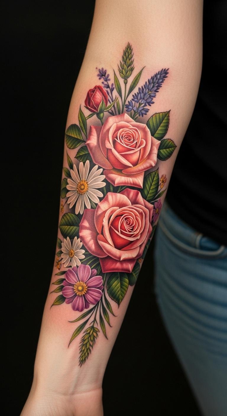 This placement allows for a graceful flow of the design, emphasizing the natural curves of the body. The roses and wildflowers not only enhance the aesthetic appeal but also carry personal significance, representing the wearer’s unique story and spirit.