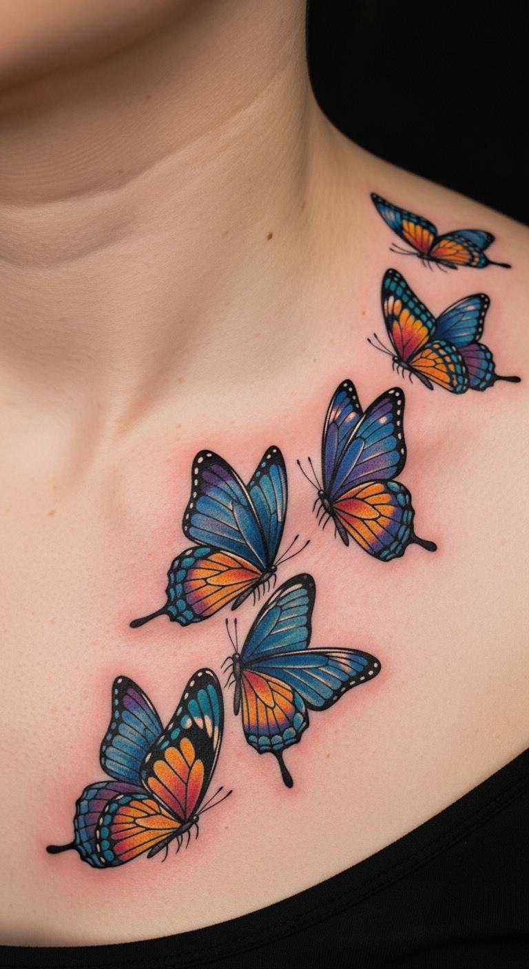 The placement of the butterflies along the collarbone enhances the natural contours of the body, symbolizing personal growth and the beauty of transformation.