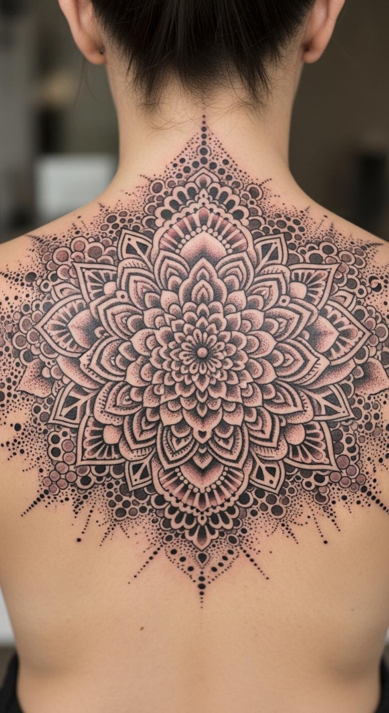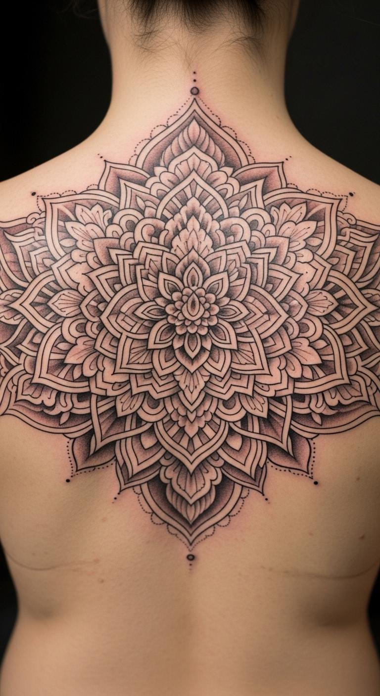 This mandala tattoo on the upper back symbolizes a journey of spiritual growth, with each layer representing deep meanings that invite reflection and meditation.