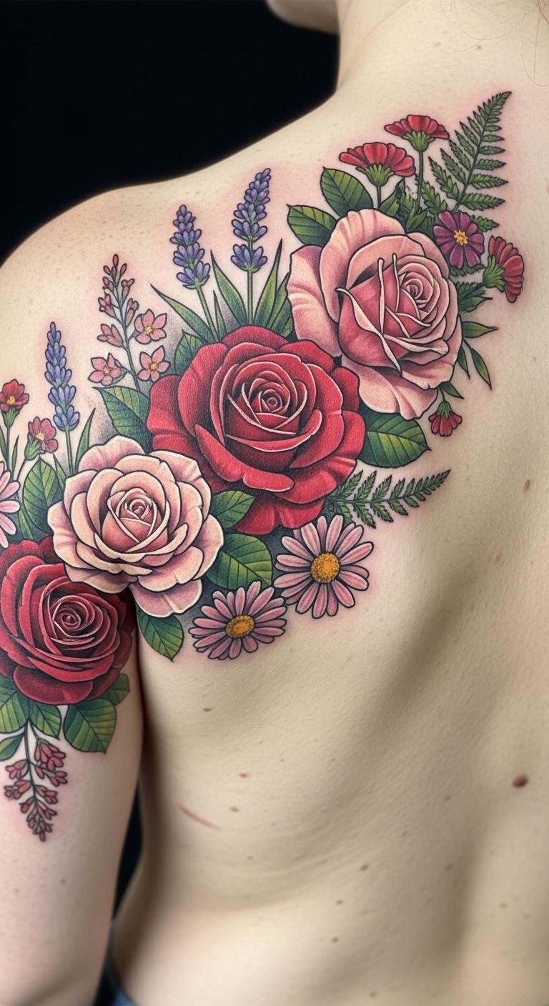 Large floral arrangements symbolize growth, beauty, and femininity, making them an ideal choice for a tattoo on the shoulder blade.