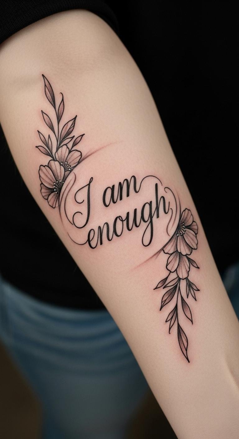 The placement of the tattoo on the forearm makes it easily visible, allowing the wearer to see and reflect on the empowering message daily. The phrase “I am enough” serves as a constant reminder of self-worth and resilience.