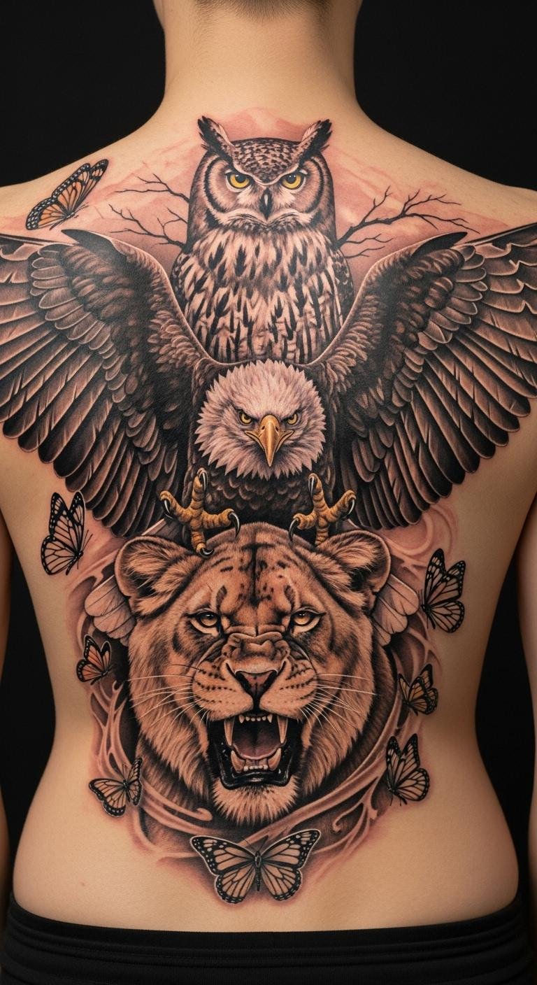 This tattoo embodies a powerful juxtaposition of strength and grace. The lioness and eagle represent unwavering courage and fierce independence, while the butterfly and owl add layers of transformation and wisdom.