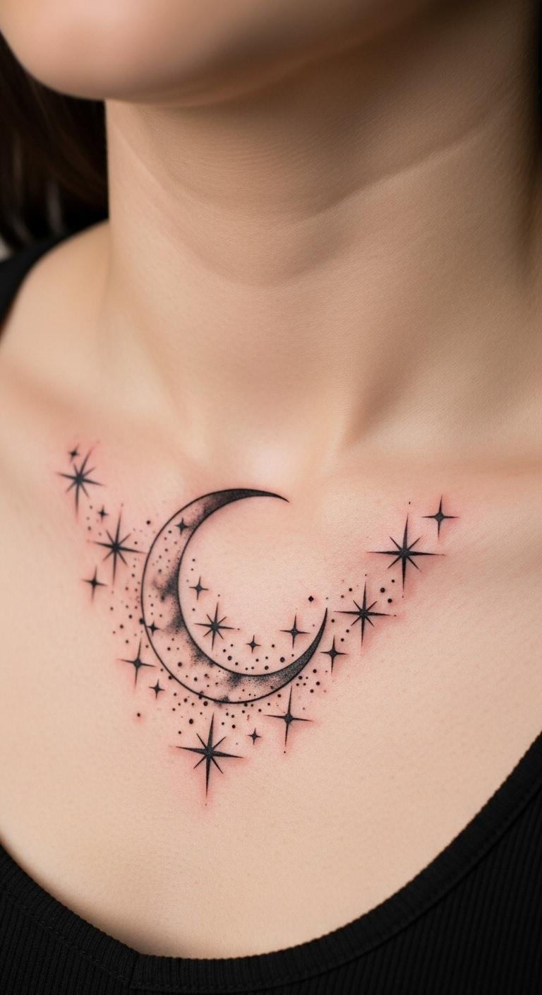 Placed on the collarbone, it serves as a reminder of freedom and individuality, visible yet intimate. The crescent moon represents change and new beginnings, while the stars reflect guidance and hope, making this tattoo a personal talisman that inspires and uplifts the spirit.