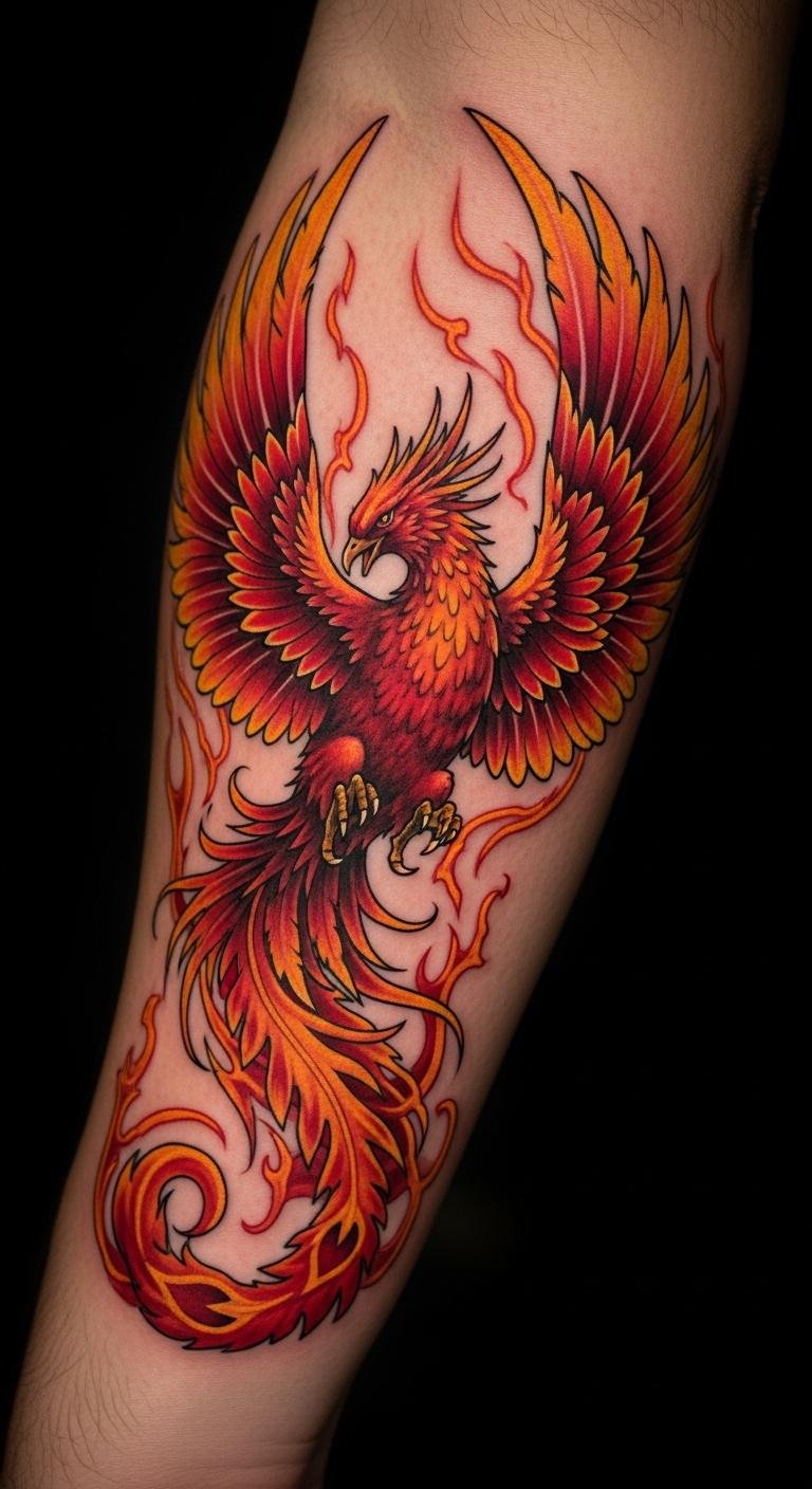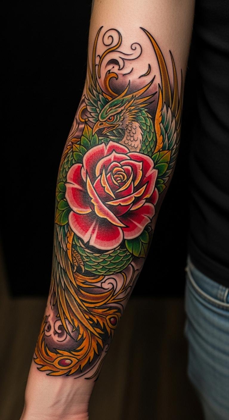 This tattoo design symbolizes resilience and transformation, as the phoenix represents rebirth and the rose signifies beauty and love.